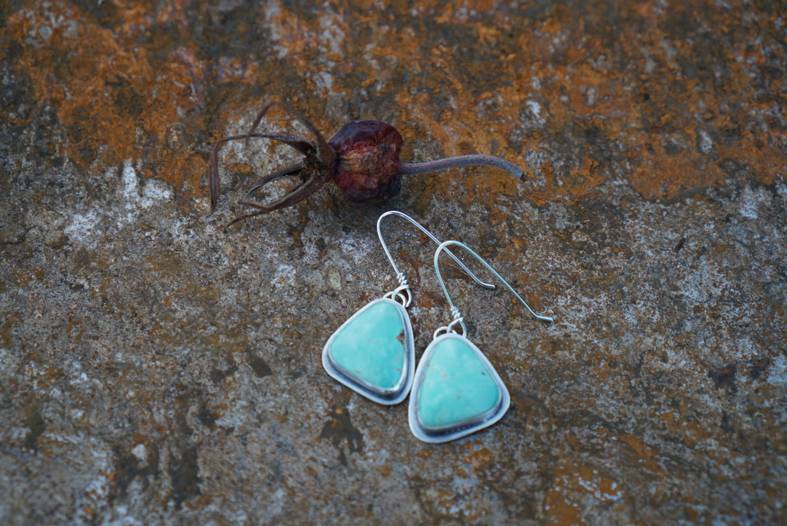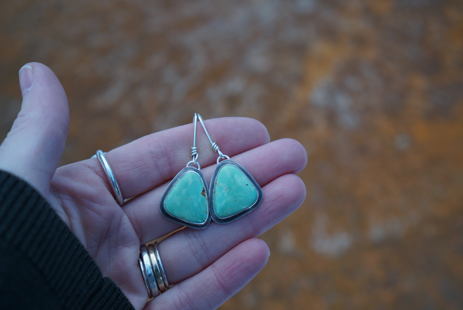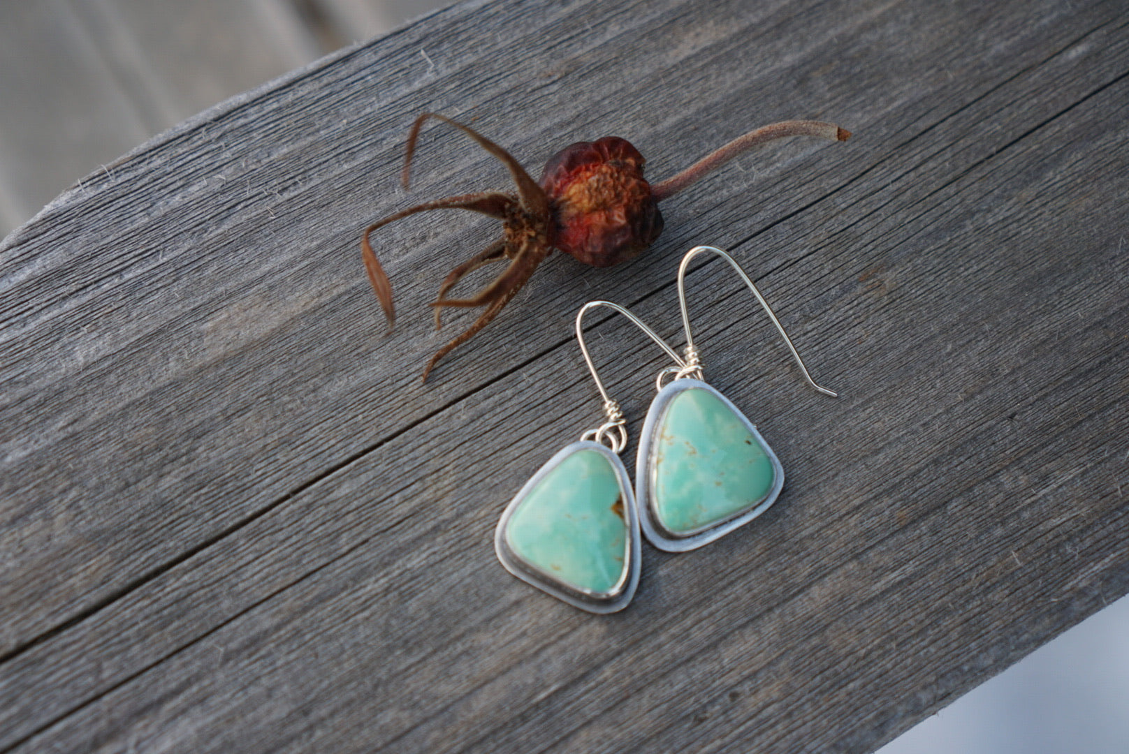 Beautiful pieces of green Kingman turquoise are simply set in fine and sterling silver and dangle from hand crafted sterling silver earwires. Earrings measure just over 1.5 inches in length from the top of the earwires the tip of the stone. The absolute perfect earrings for everyday.