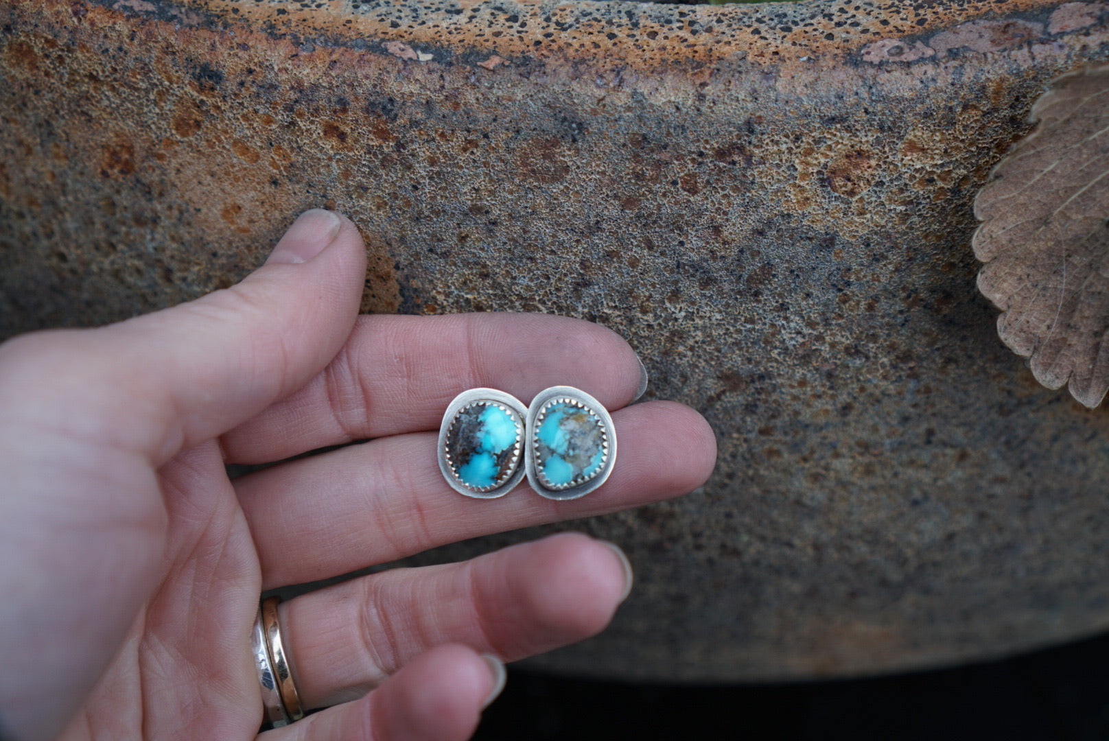 The perfect posts. Fantastic slices of all natural American Mined Carlin Turquoise are simply set in Sterling Silver. Posts are sturdy and comfortable with sterling silver earnuts. Earrings are oxidzed and polished for a soft rustic finish.