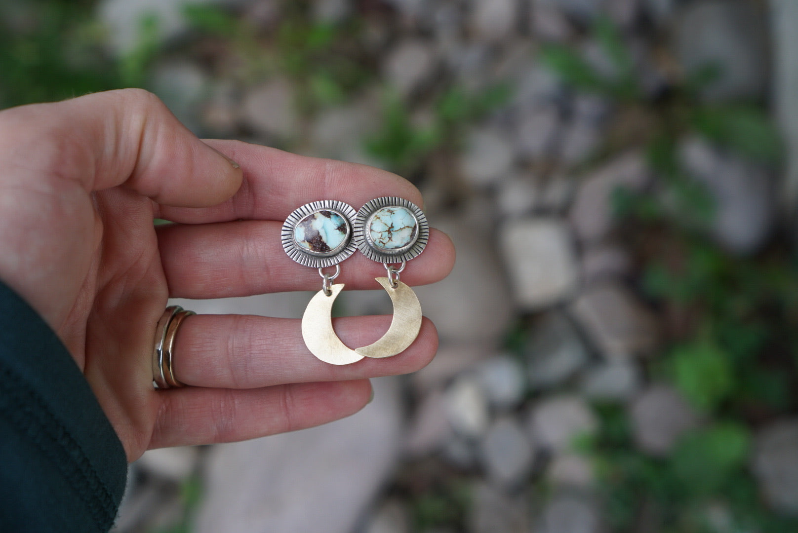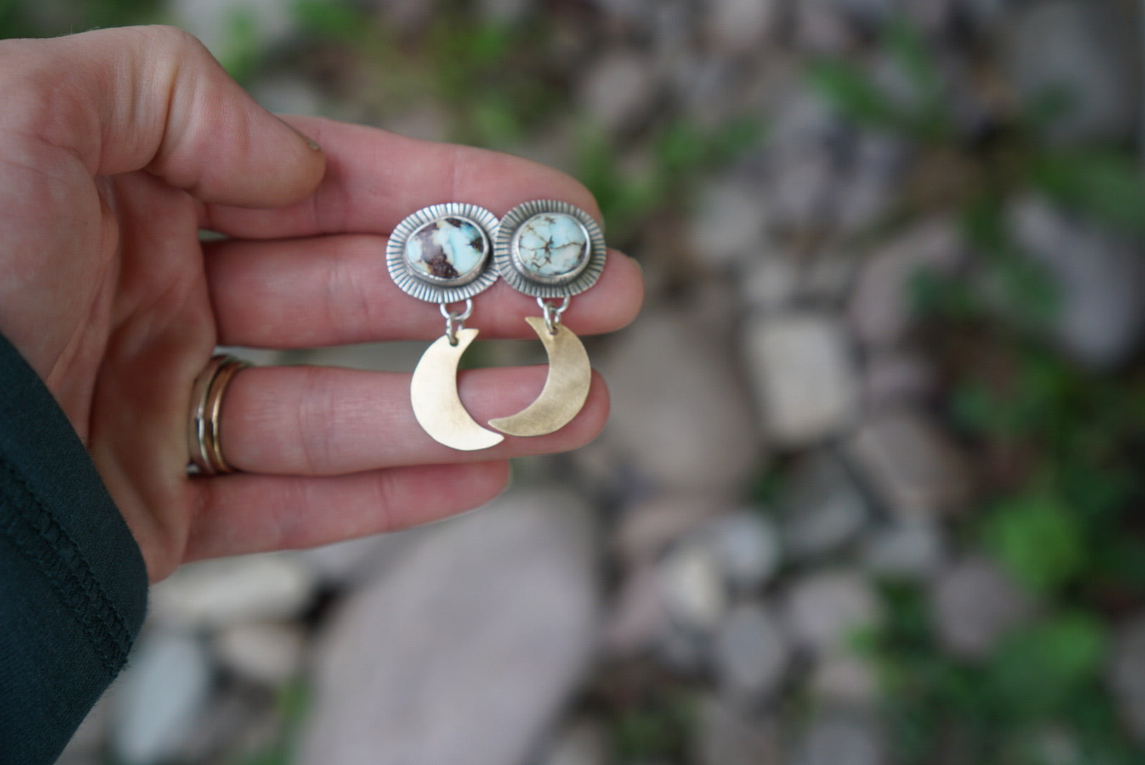 Wonderful and unique little posts. Fantastic slices of all natural Lavender Turquoise are simply set in Sterling Silver and hand stamped sunburst details along the edges, below dangle hand sawed crescent moons in golden jewelers brass. Posts are sturdy and comfortable and finished with sterling silver earnuts. Earrings are oxidzed and polished for a soft rustic finish.