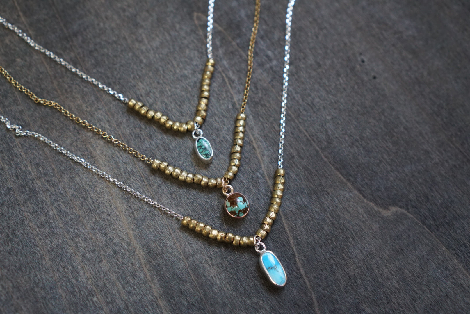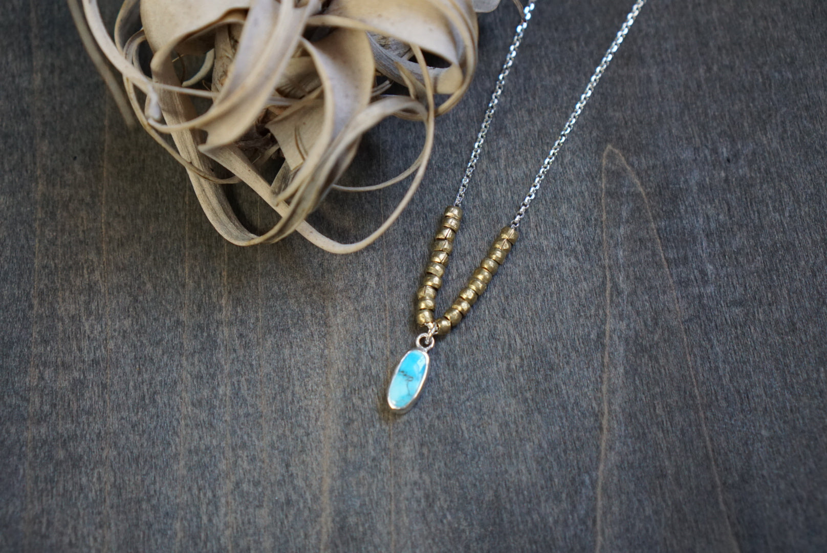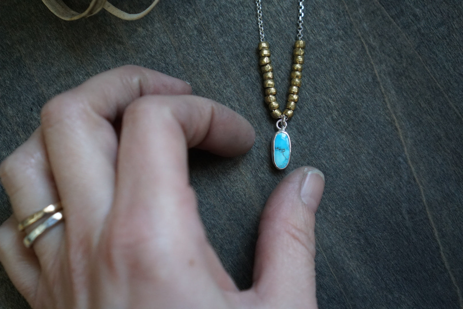 THE Cutest little everyday necklace featuring a gorgeous little piece of American Turquoise. This necklace is absolutely perfect for everyday wear and for layering. Turquoise is simply set in fine and sterling silver and hangs from a dainty but sturdy 18 inch sterling silver rolo chain complete with unique brass African Trade Beads on the chain for extra detail.