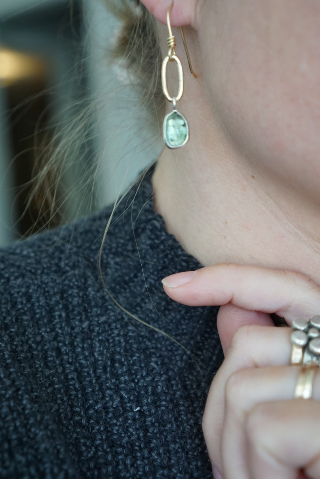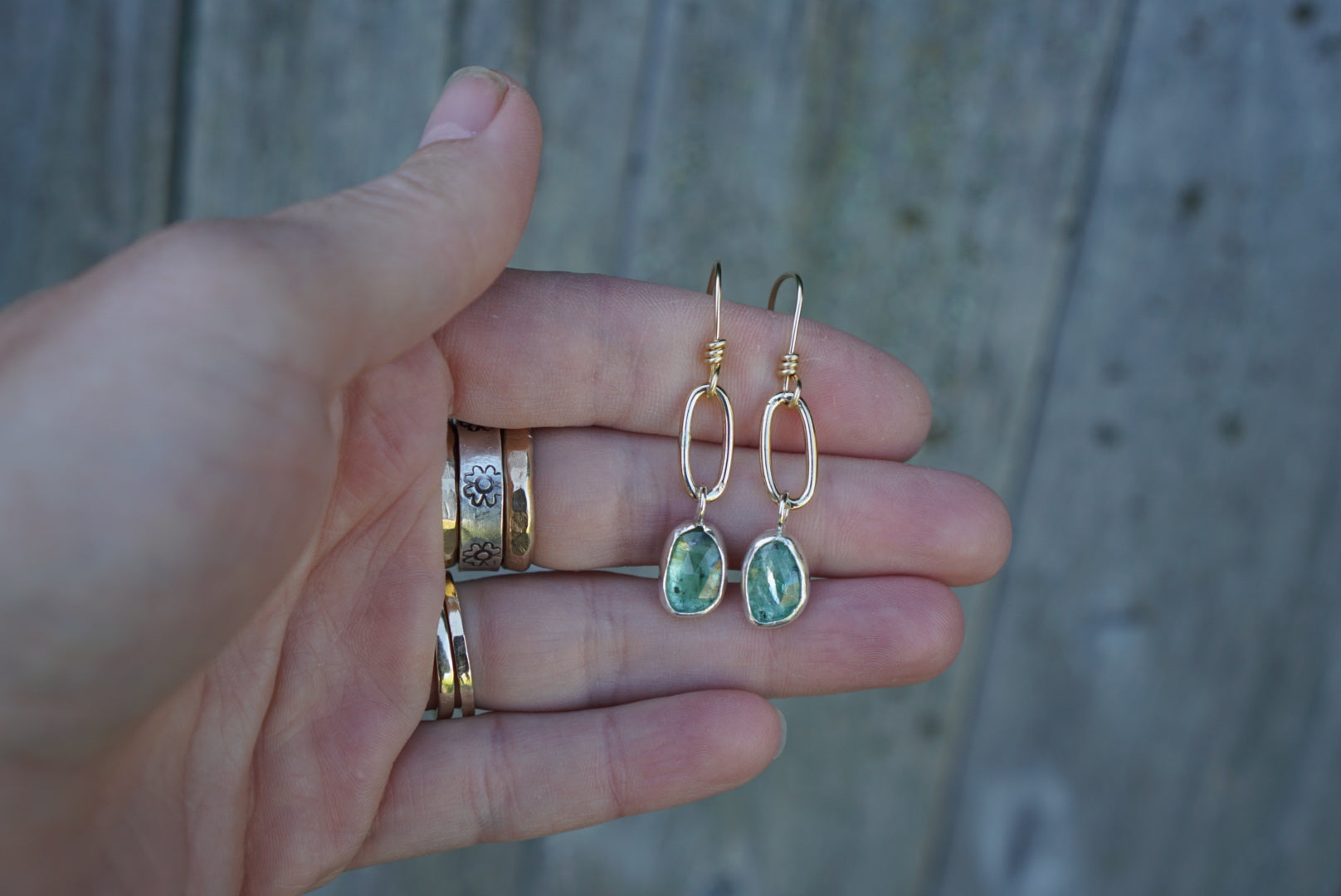 These earrings are so sweet. I love how simple they are yet they still make a little statement. Little green rose cut kyanite stones are wrapped in silver and dangle below little 14K gold fill links. These are a perfect staple pair of earrings, excellent for the everyday. These measure just over 1.5 inches long and are finished with handmade 14K Gold fill earwires.