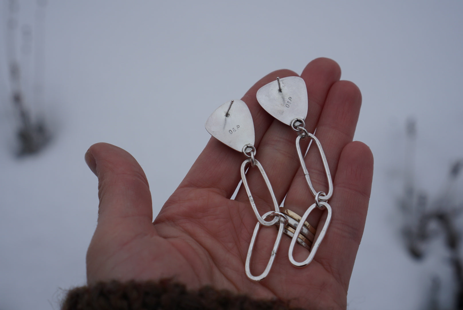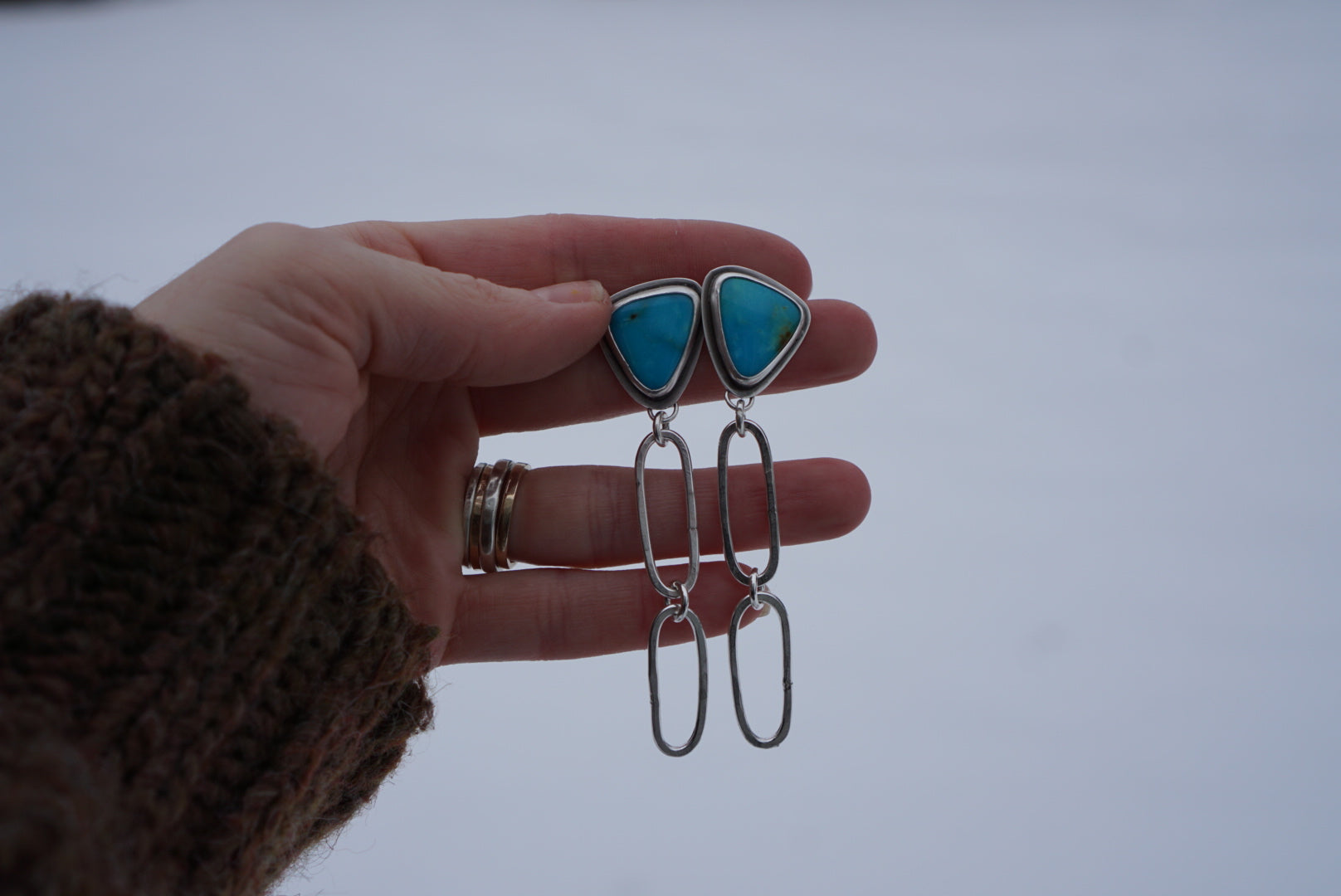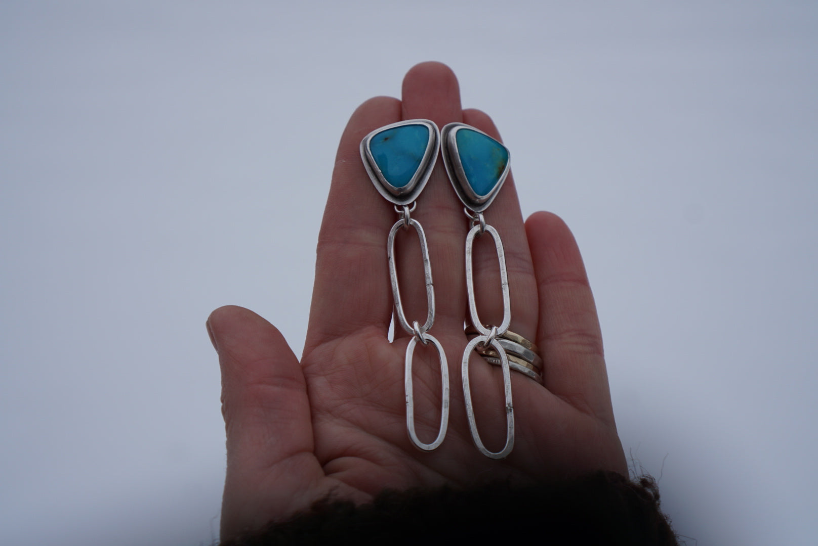 These earrings are so cool. I love how simple they are yet they still make a statement. Gorgeous slices of blue turquoise are simply set in silver and below dangles two handcrafted paperclip chain links. These are so easy to wear and go with everything. Finished with sterling silver earnest and comfort clutch earnuts. They measure about 3 inches from the top of the post to the bottom of the chain.
