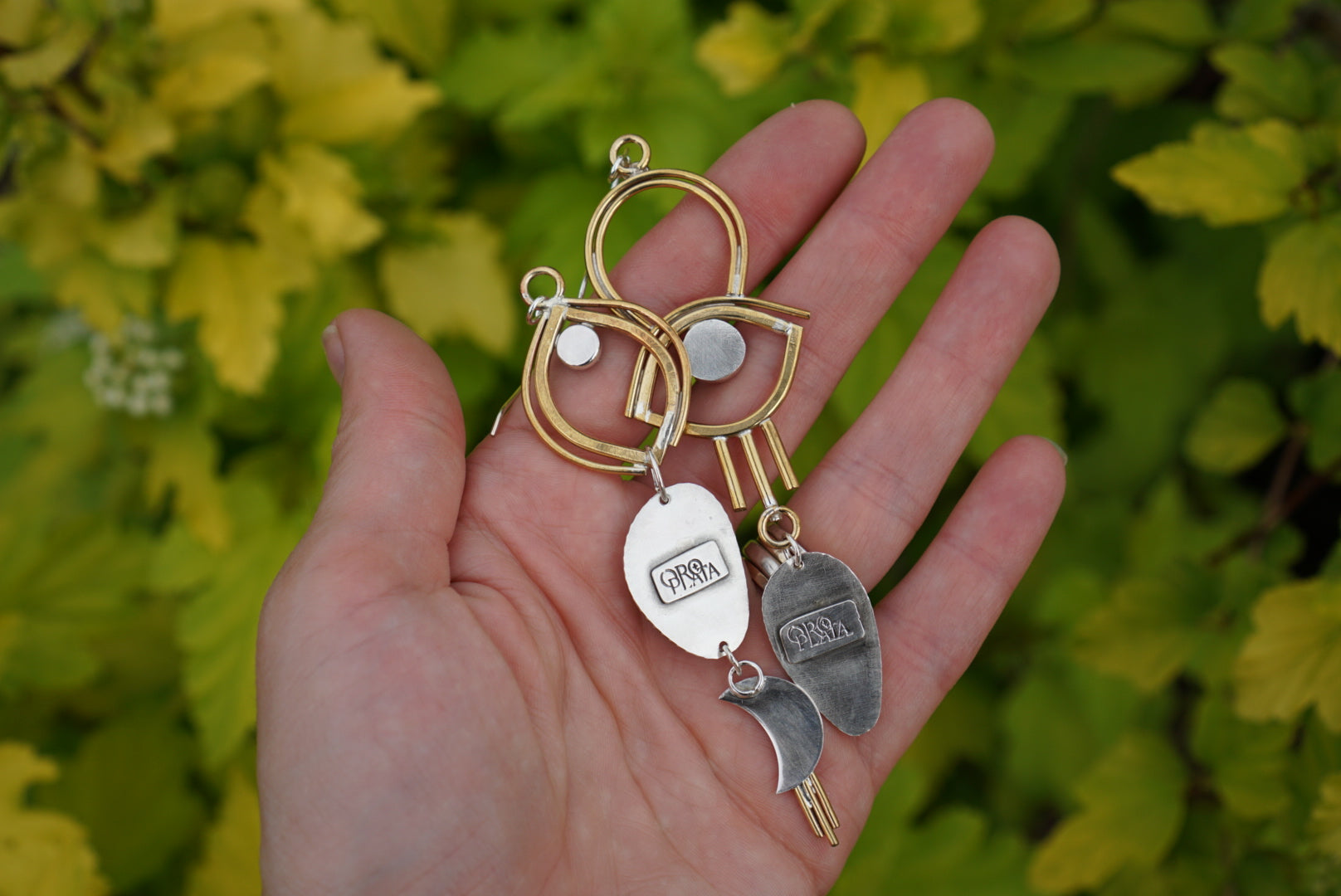 These earrings are so special, and an installation in my Divine Feminine Collection. I've created a unique pair of earrings featuring two different vibes in each earring. First, a brass flowering almond shape with a blue Lapis gemstone perched at the top and dangling below a silver sunburst turquoise stone and crescent moon. The second, brass arches loop above an eye shape with turquoise inside and a slice of Lapis wrapped in sunburst silver dangling below. Interesting and beautiful!! These hang from handcrafted sterling earwires and measure about 3.5 inches in length.