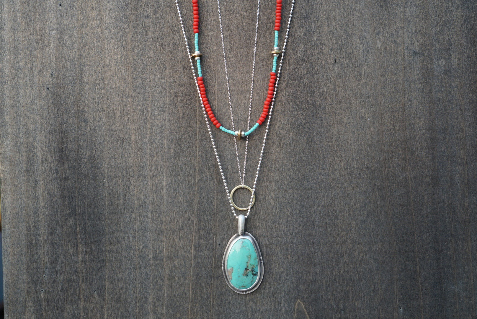 Fun and beautiful necklace set including three necklaces that can be worn layered together or all on their own. This set includes a simple fine and dainty necklace with brass circle charm on an 18 inch delicate chain, a statement pendant made of reclaimed sterling silver and lovely slice of Kingman Turquoise gemstone on a 22 inch ball chain and a beaded choker strung on silk and made with seed beads, brass, and sterling silver beads and measures 16.5 inches with a 1.5 inch extender.