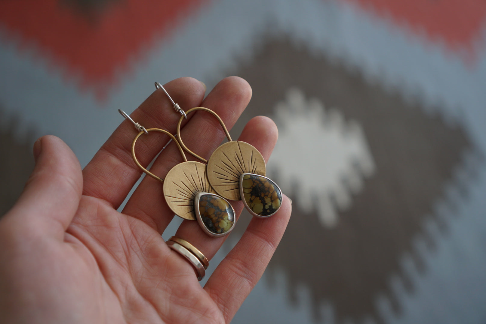 One of my all time favorite designs. This pair features beautiful green, brown and black matrix Hubei Turquoise simply set in sterling silver and perched at the bottom of brass discs with hand stamped sunburst details. Brass loops crown the discs and dangle from handmade sterling silver earwires. Earrings dangle about 2.75 inches from the top of the earwire to the base of the stone. Brass is also subject to oxidation and will naturally darken with time. I love how brass looks as it ages, but if it’s not for you, polish on a regular basis to keep them shiny.
