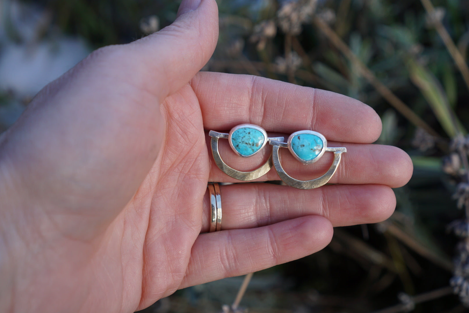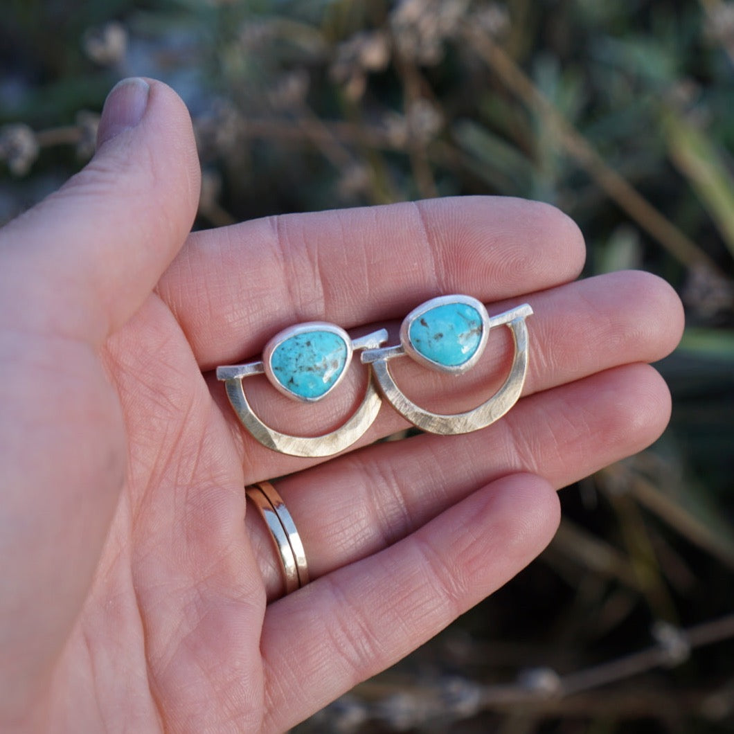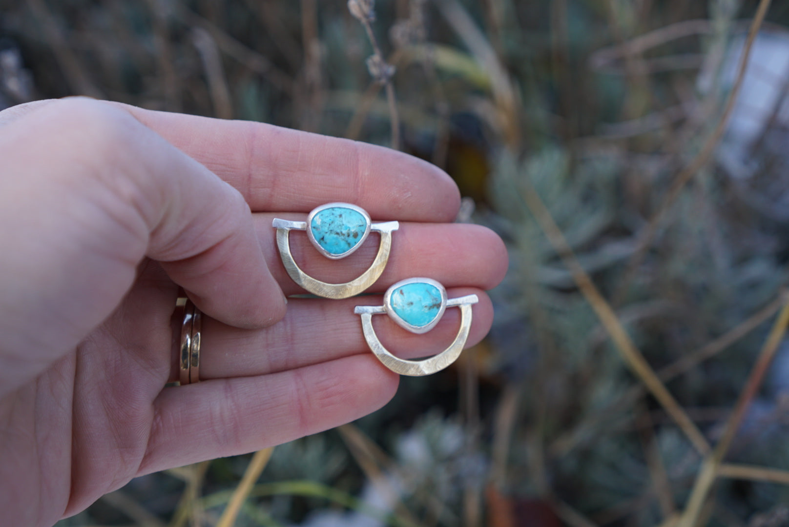 Classic O+P post earrings. Fantastic slices of American Mined Turquoise are simply set in thick Sterling Silver with hand forged mixed metal loops below. Earrings are oxidzed and polished for a soft rustic finish and measure 25mm in diameter.