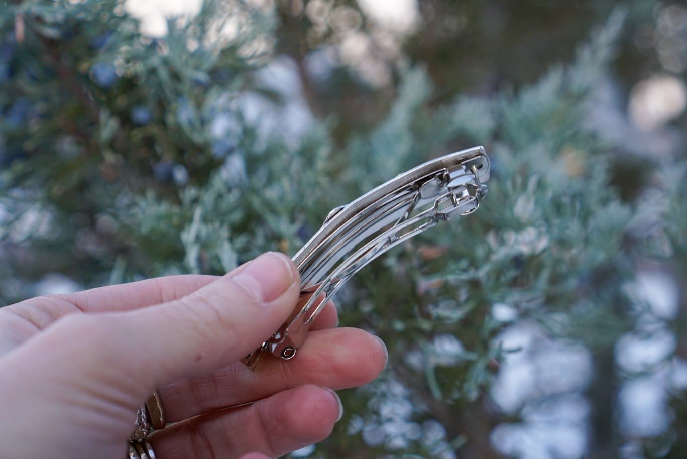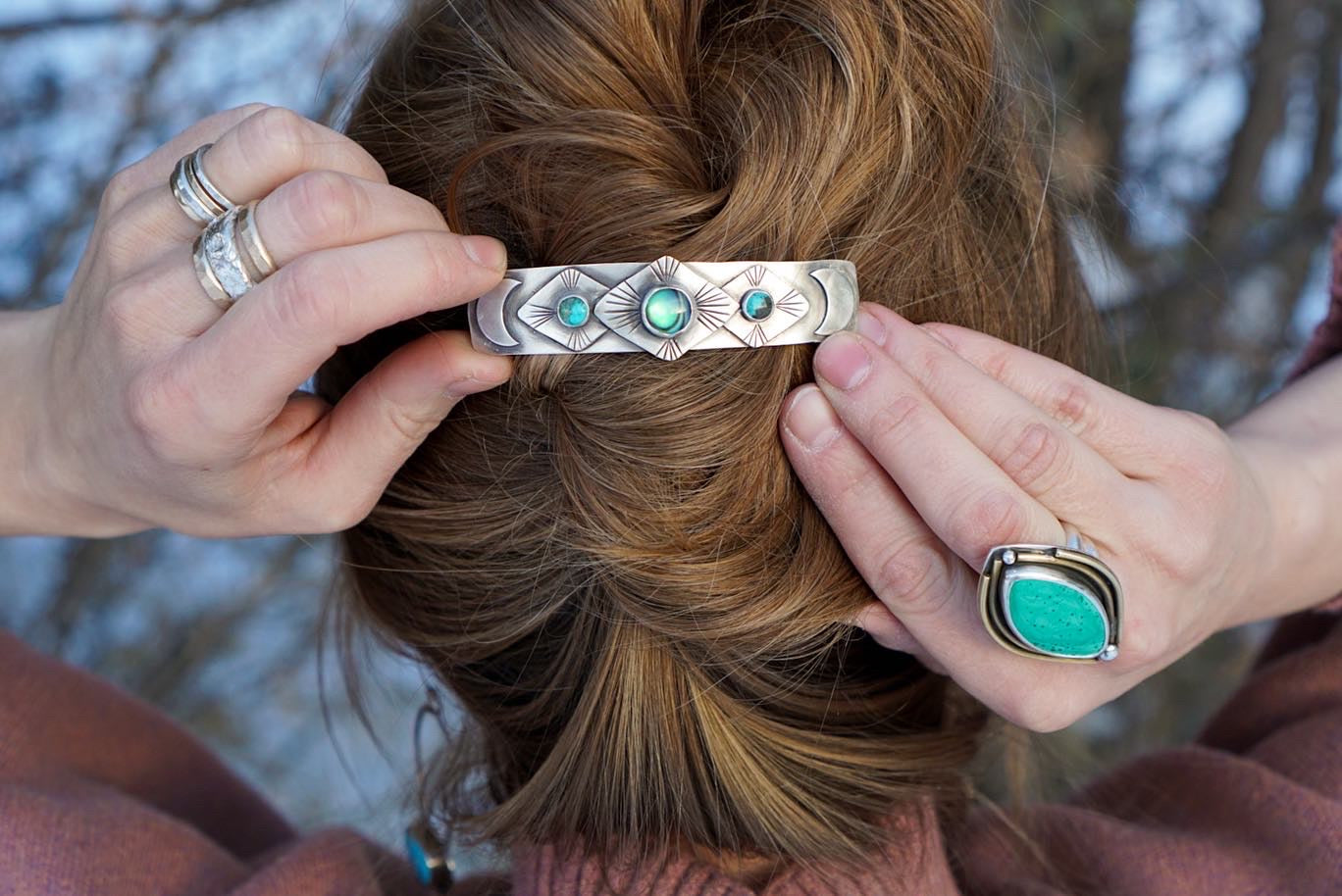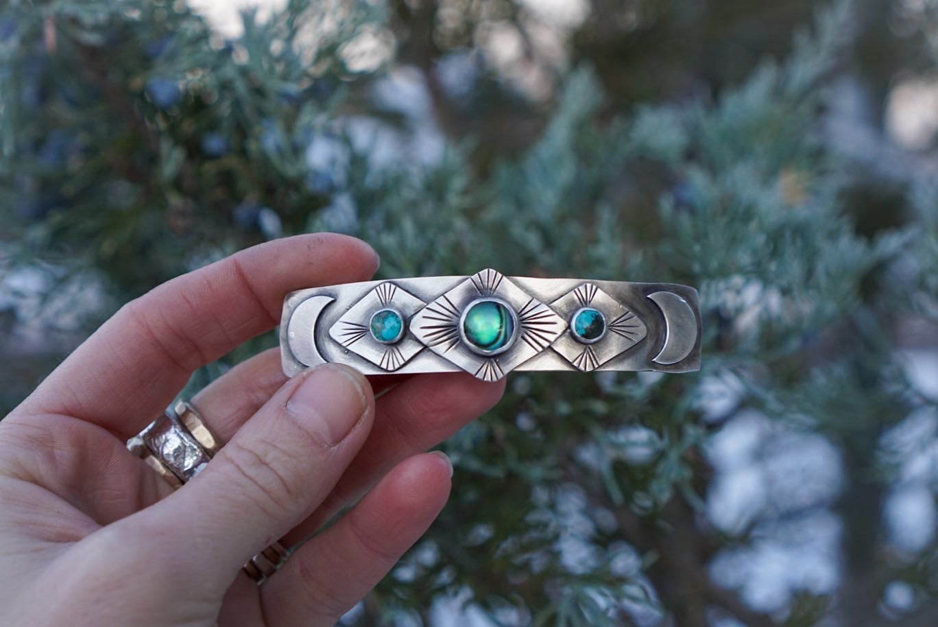 A Gorgeous french clip made with layers of crescent moon and diamond hand stamped silver and multiple Abalone stones. About 80mm across. Perfect for all types of hair.