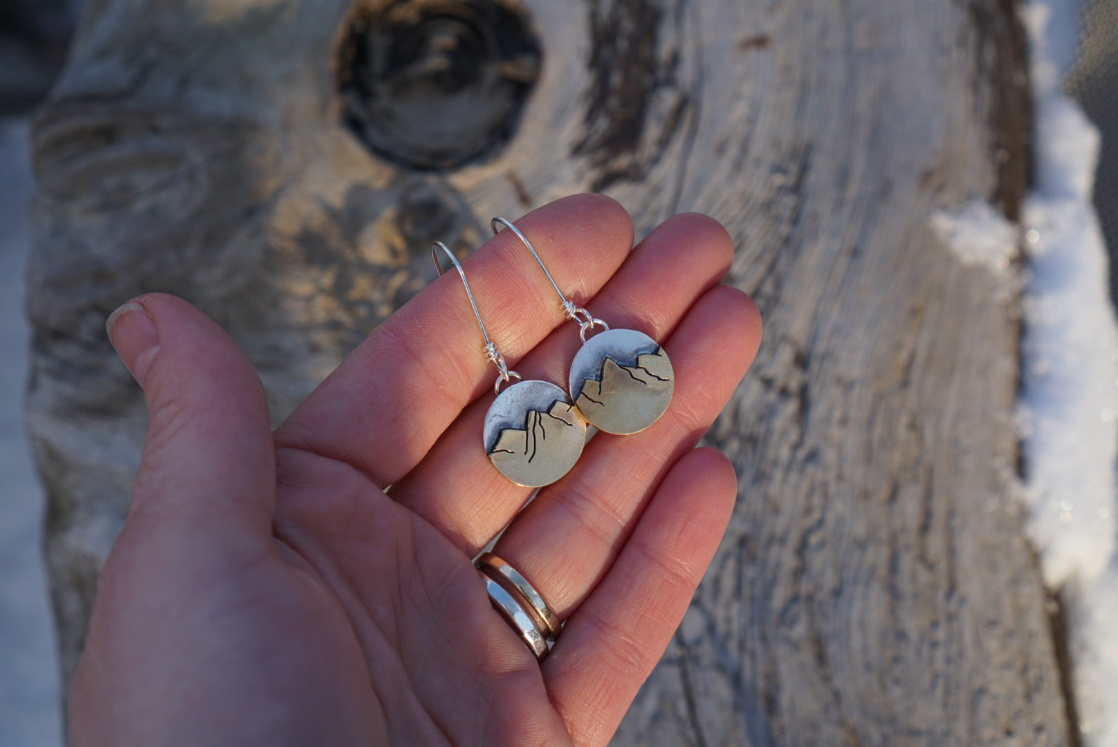 These earrings go with everything! Handmade Sterling silver discs accented with pretty little brass mountainscapes layered on top. Lightweight and comfortable. Earrings dangle about 1.5 inches long and about .75 wide and hang from handcrafted sterling silver earwires.