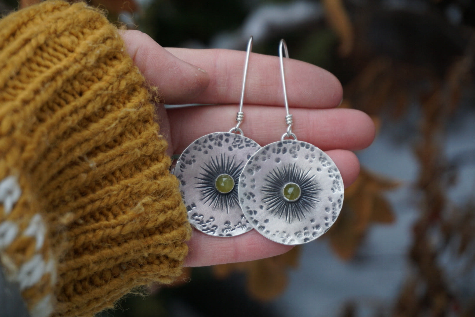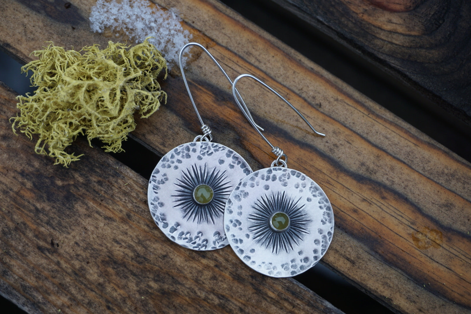 Gorgeous large disc earrings featuring sparkly little Peridot gemstones. These are heavily textured and every line is individually hand stamped with lots of love creating a pretty little starry night sunburst design. These earrings are light and comfy, and are simple but bold all at the same time and measure just over 2.5 inches long. Earrings hang from extra long hand crafted earwires and are oxidzed and polished for a soft rustic finish.