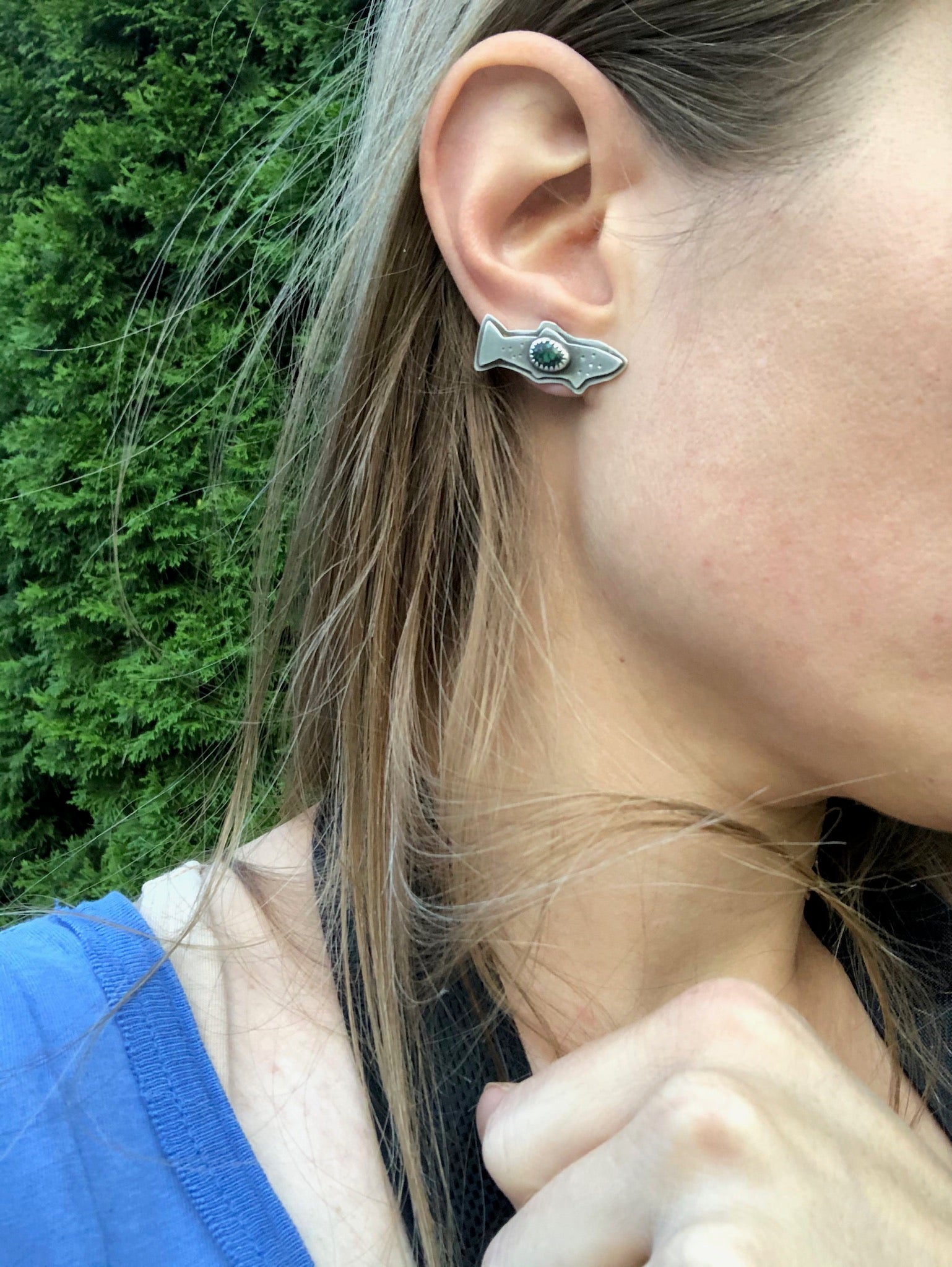 The perfect Trout post earrings. Named after the freestone rivers and the trout that inhabit them, these earrings are hand drawn, sawed and appliquéd with a little webbed turquoise gemstone nestled on top and hand stamped for some fishy texture. These ride the ear like a climber, And are simple but bold all at the same time. Posts are sturdy and comfortable with sterling silver earnuts. Earrings are oxidzed and polished for a soft rustic finish.