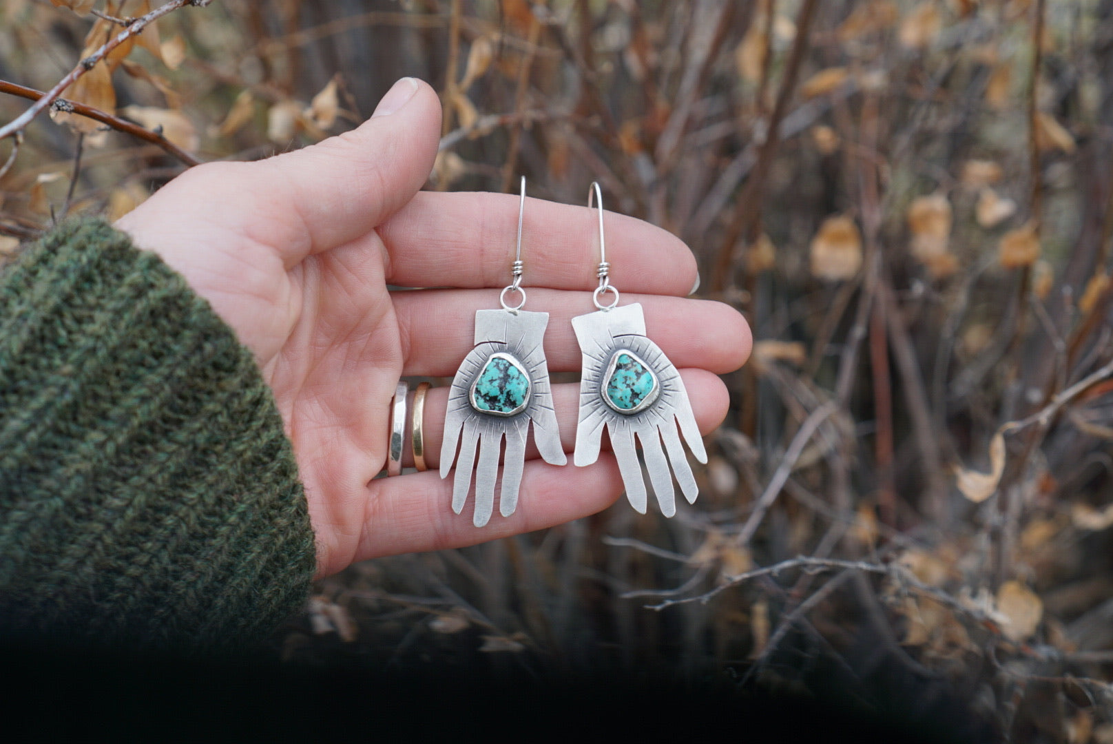 These amazing Frida inspired earrings are simple statements and beautiful. Hand drawn, sawed and textured hands have little raw Alacron nugget turquoise in the center . Earrings are oxidized and polished for a soft rustic finish and dangle from hand crafted sterling silver earwires. Earrings measure about 2.5 inches from the top of the earwires to the base of the earring and about 1 inch across at their widest point.
