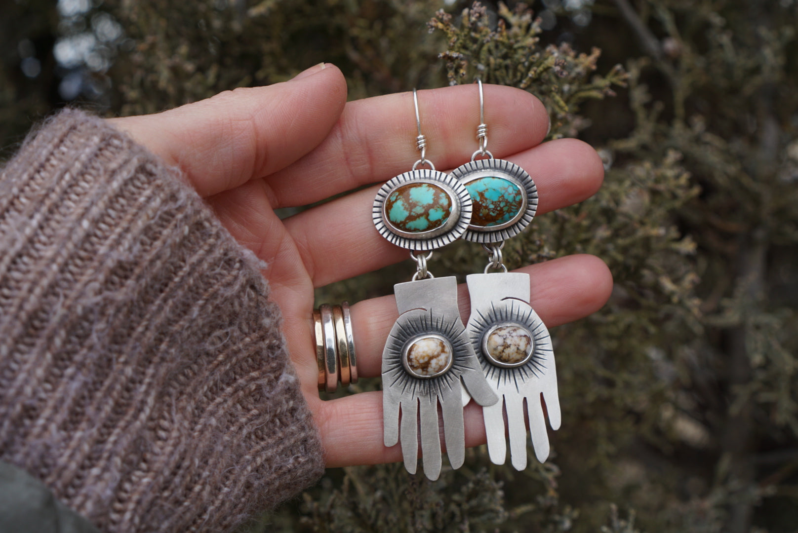 These amazing Frida inspired earrings are bold and beautiful. Hand drawn, sawed and textured hands have little creamy Wild Horse Magnesite in the center and dangle beneath larger No. 8 Mine turquoise gems perched on hand stamped sterling silver. Earrings are oxidized and polished for a soft rustic finish and dangle from hand crafted sterling silver earwires. Earrings measure about 3.25 inches from the top of the earwires to the base of the earring and about 1 inch across at their widest point.