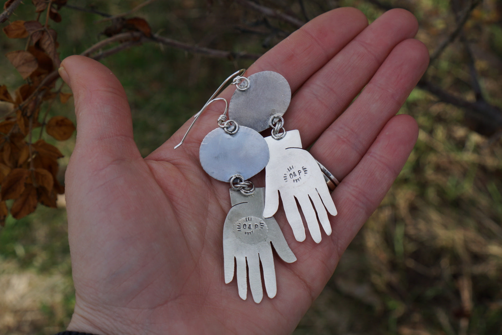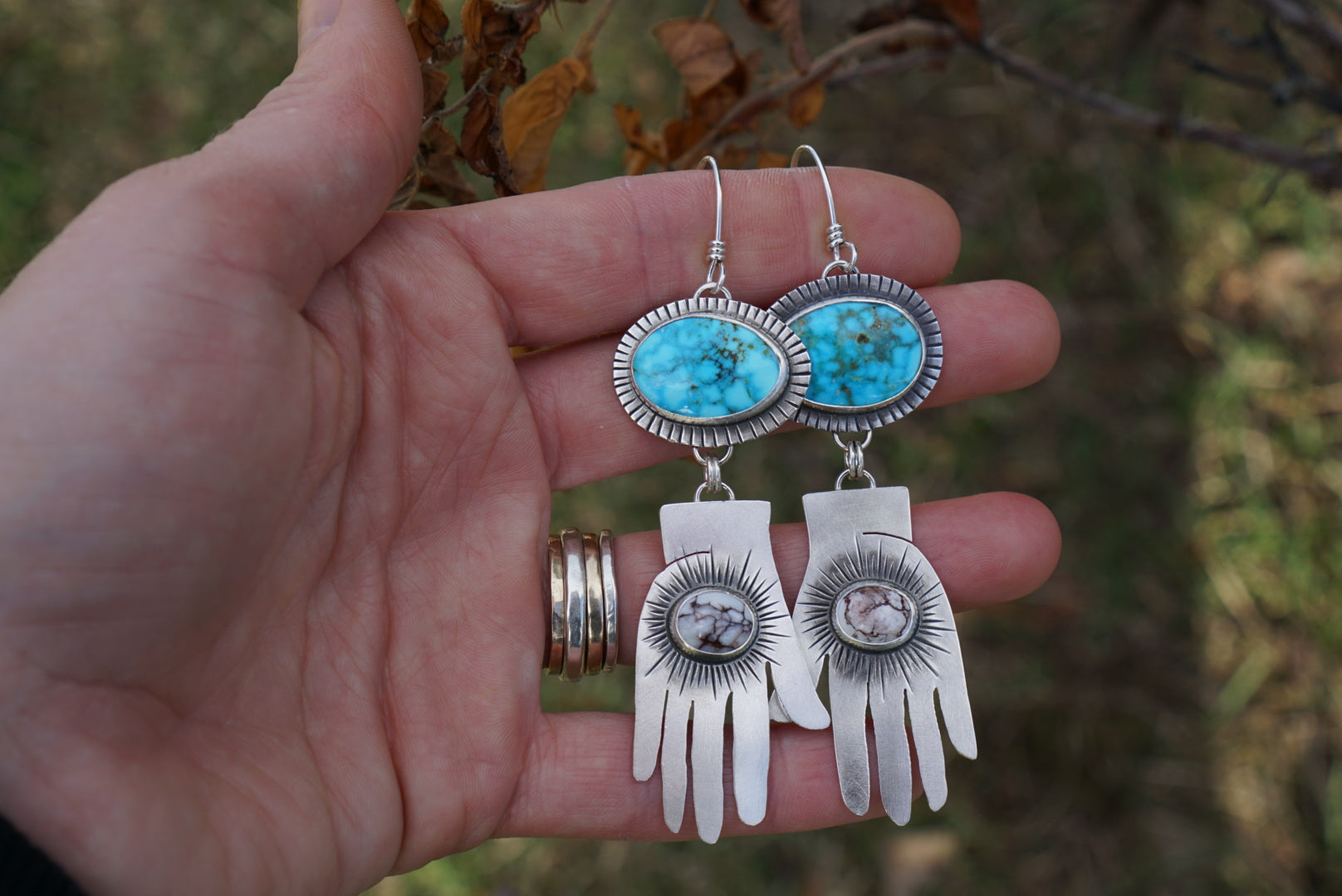 These amazing Frida inspired earrings are bold and beautiful. Hand drawn, sawed and textured hands have little creamy Wild Horse Magnesite in the center and dangle beneath larger blue turquoise gems perched on hand stamped sterling silver. Earrings are oxidized and polished for a soft rustic finish and dangle from hand crafted sterling silver earwires. Earrings measure about 3.25 inches from the top of the earwires to the base of the earring and about 1 inch across at their widest point.