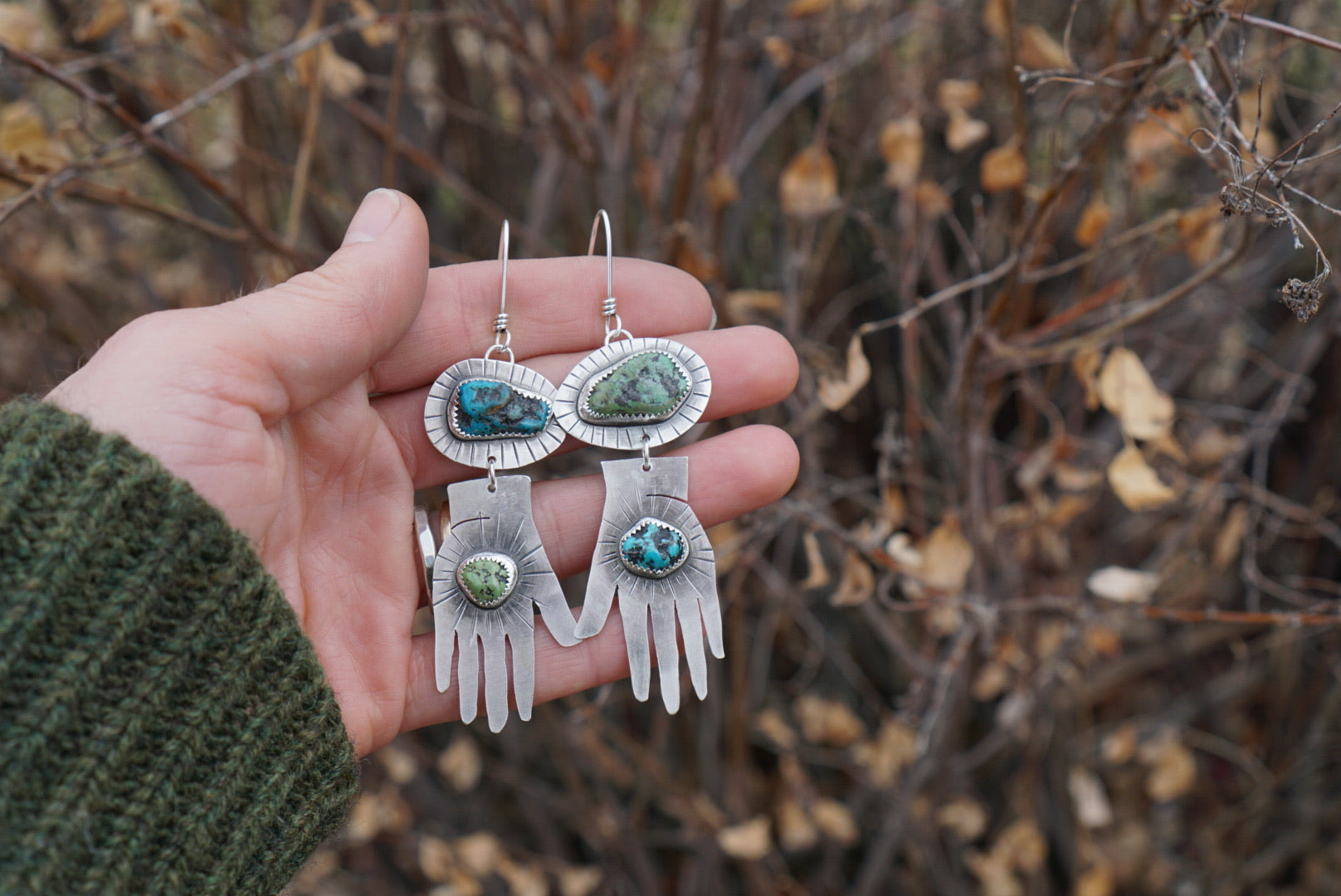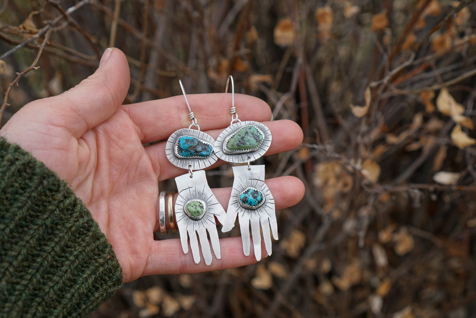 These amazing Frida inspired earrings are bold and beautiful. Hand drawn, sawed and textured hands have little raw Alacron nugget turquoise in the center and dangle beneath larger Alacron nuggets perched on hand stamped sterling silver. Earrings are oxidized and polished for a soft rustic finish and dangle from hand crafted sterling silver earwires. Earrings measure about 3.25 inches from the top of the earwires to the base of the earring and about 1 inch across at their widest point.