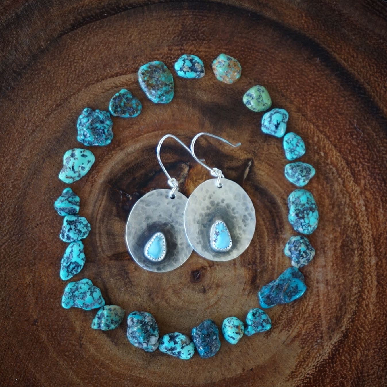 These pretty little earrings are amazing for everyday wear. Lightweight and comfortable with hand cut and hammered sterling silver rounds and featuring little Lavender Turquoise gemstones! Earrings hang from hand made sterling silver earwires and measure about 1.75 inches long.