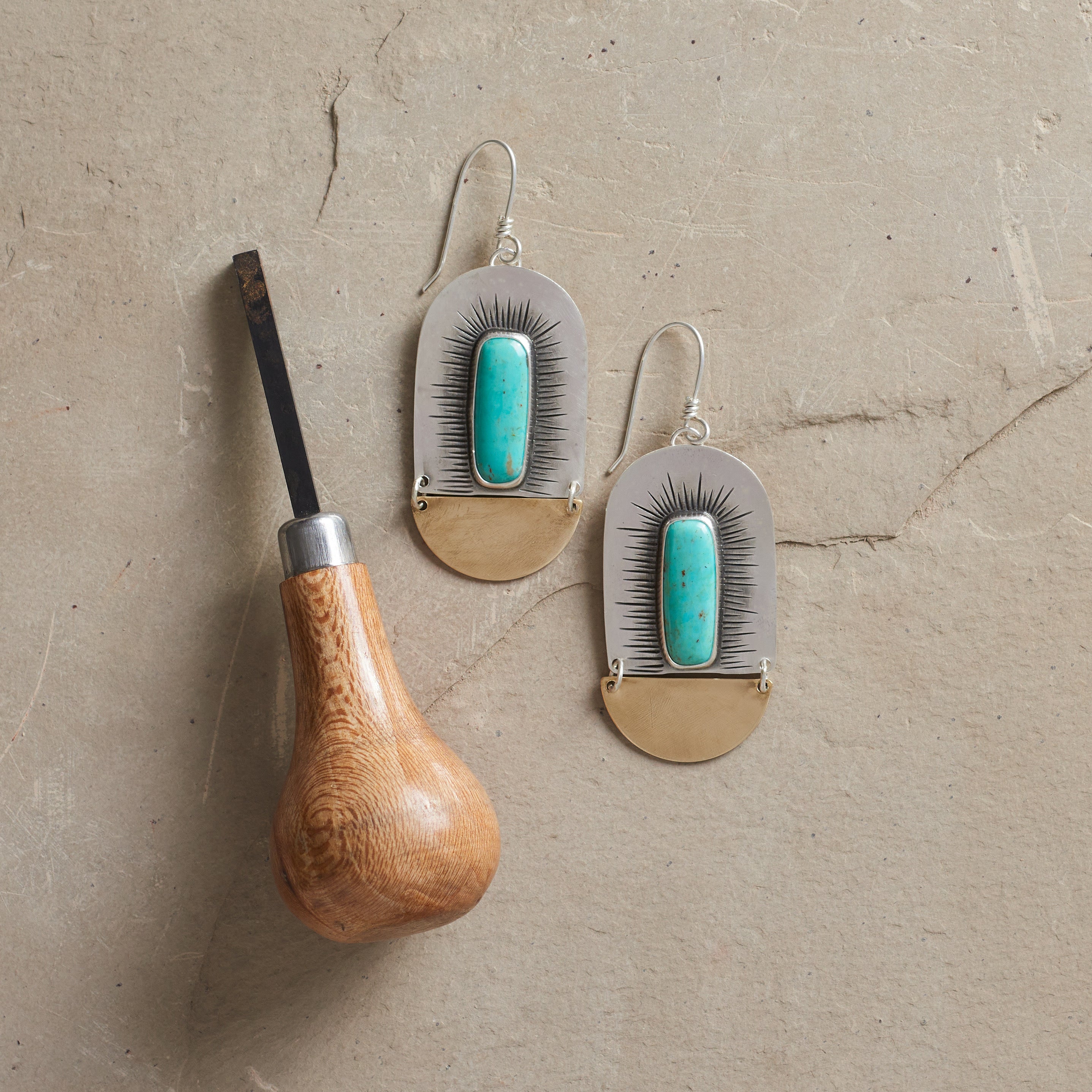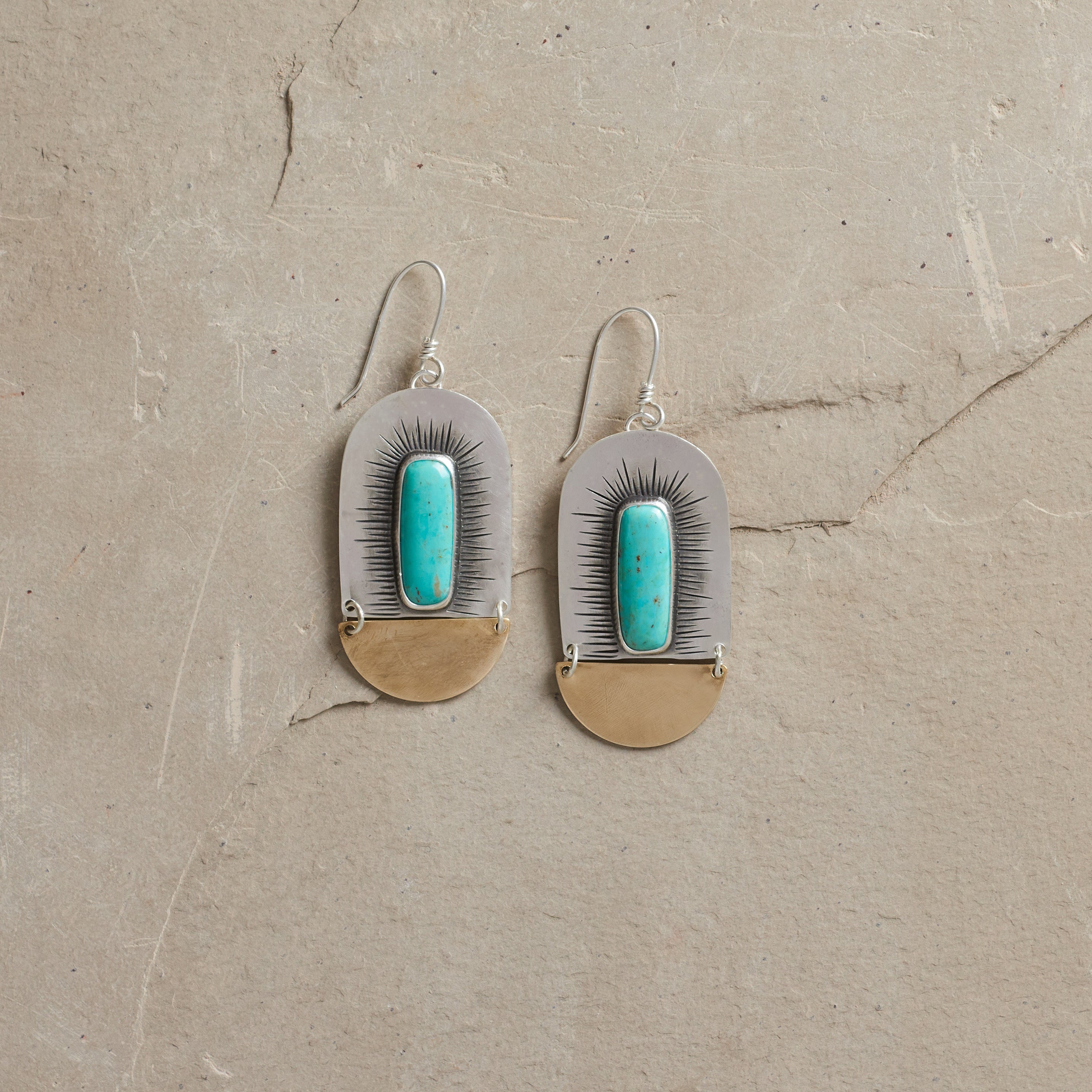 Gorgeous earrings completely handcrafted and featuring arch shaped sterling silver with bright blue Turquoise gemstones front and center with hand stamped sunburst details around them. Below dangles a golden half moon brass disc. Oxidized and polished for a soft rustic glow. Finished with handmade sterling silver earwires and dangle just over 2.5 inches long.