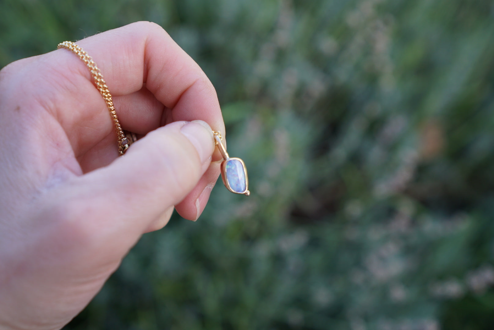 Gorgeous little everyday necklace featuring high grade Australian Opal and solid 14k Gold bezel setting and dot accent. Backplate is sterling silver and purity stamped. This beautiful dainty pendant hangs from a 14k gold fill chain that measures 18 inches long.
