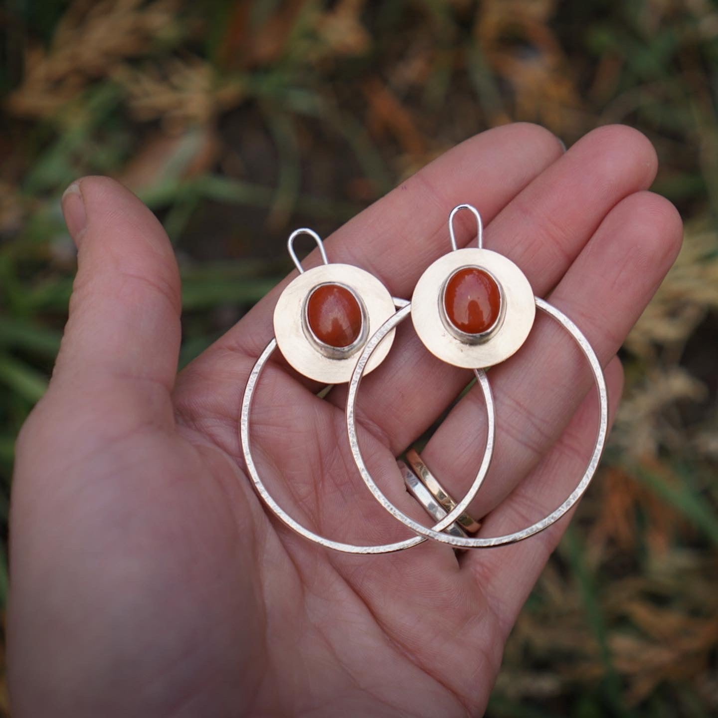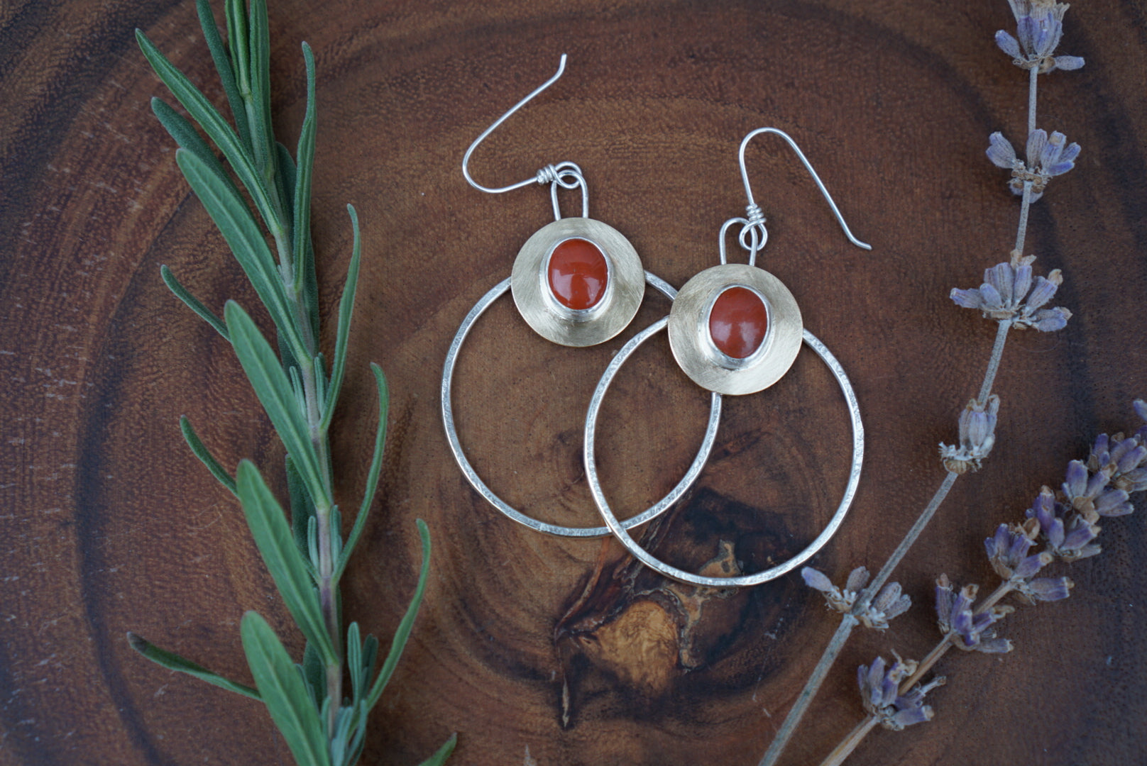 Beautiful medium sized everyday hoops featuring gorgeous earthy reddish orange Red Jasper gemstones set in silver and nestled inside brass discs atop sterling silver hoops. Earrings are completely handmade from brass, fine and sterling silver and dangle from handmade sterling silver earwires. Hoops measure about 1.75 inches in diameter and hang just under 3 inches long and are extra light and comfy for everyday wear.