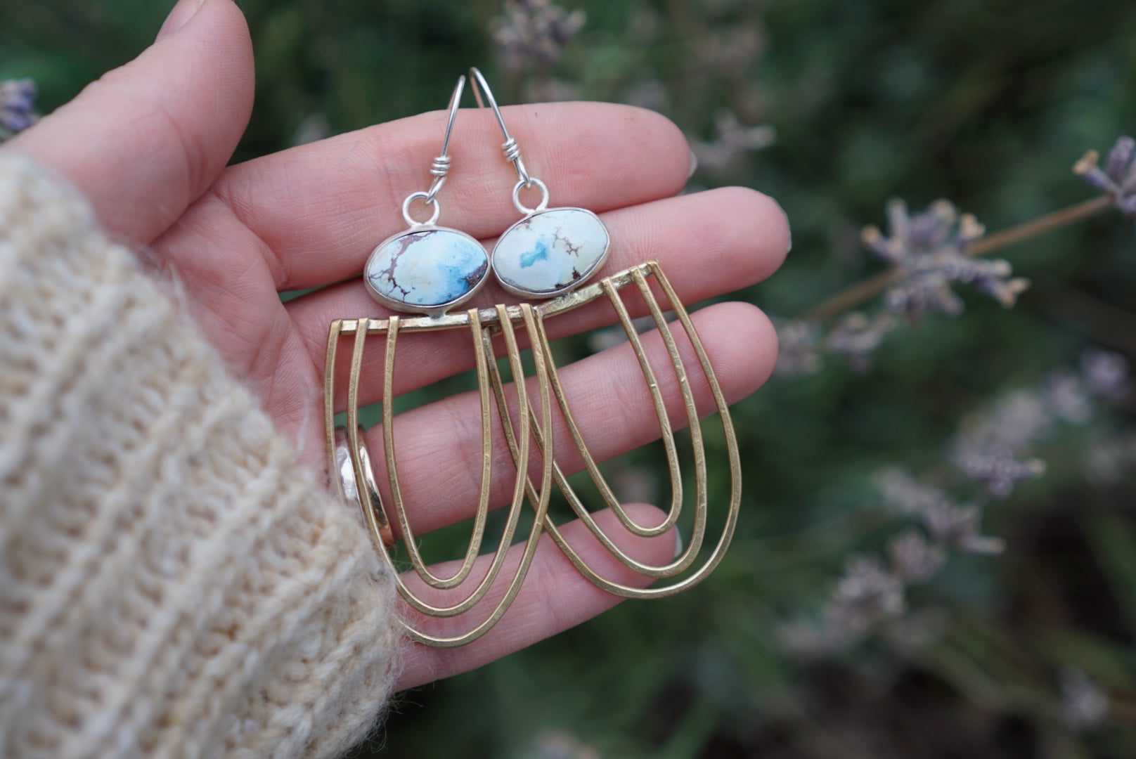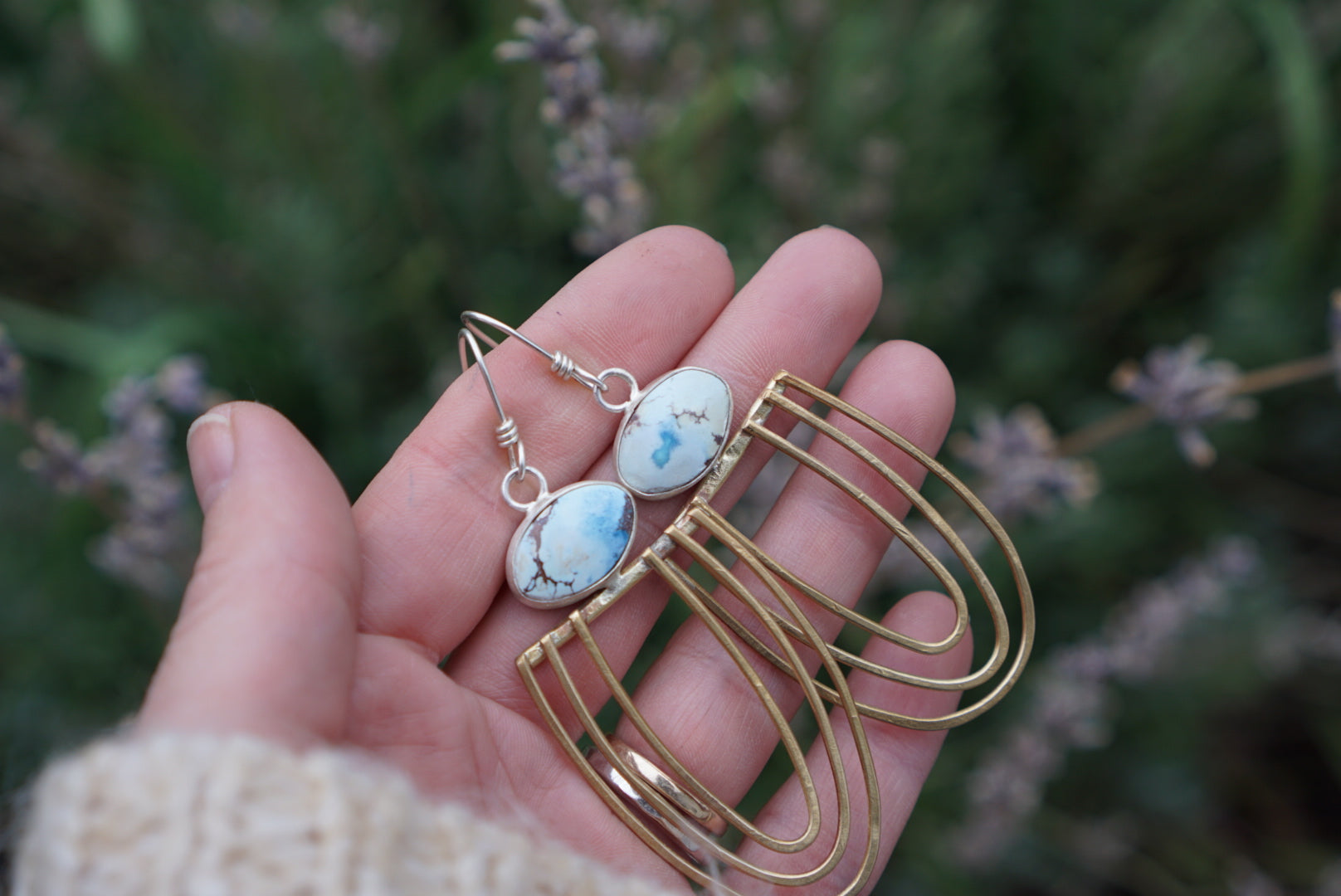 Beautiful medium sized everyday earrings featuring gorgeous dusty Lavender Turquoise gemstones set in silver and nestled on top of triple brass wire loops below. Earrings are completely handmade from brass, fine and sterling silver and dangle from handmade sterling silver earwires. They measure about 1.25 inches across and hang just over 3 inches long and are extra light and comfy for everyday wear.