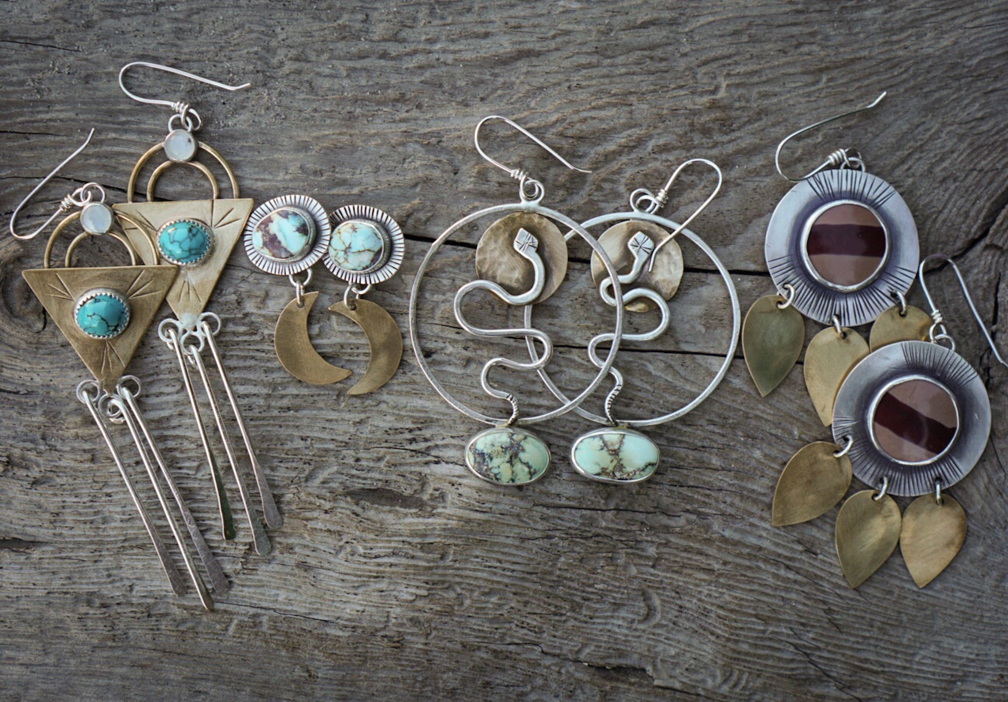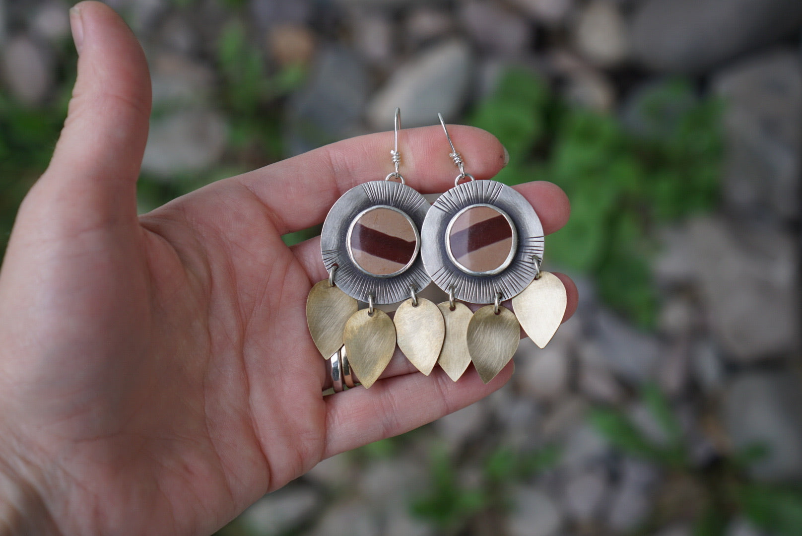 These earrings have so much movement and would be perfect for a night dancing! Featuring moon shape brass discs with gorgeous dusty rose and wine colored Banded Jasper nestled in the center and hand stamped details all along the edges and three brass tear drop charms dancing at the the bottom. Finished with hand crafted earwires complete these beauties. Oxidized and polished for a soft rustic glow. Measure about 2.75 inches from top of earwires to bottom of fringe.