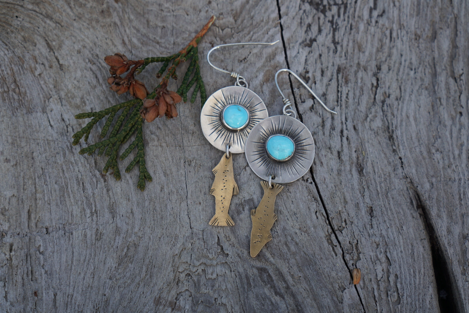 Gorgeous disc earrings featuring pretty little blue Kingman Turquoise gemstones with brass brown trout charms dangling below. These are hand textured and every line and dot is individually hand stamped with lots of love creating a pretty little fish and sunburst design. These earrings are light and comfy, and are simple but bold all at the same time and measure just about 2.75 inches long. Earrings hang from hand crafted earwires and are oxidzed and polished for a soft rustic finish.