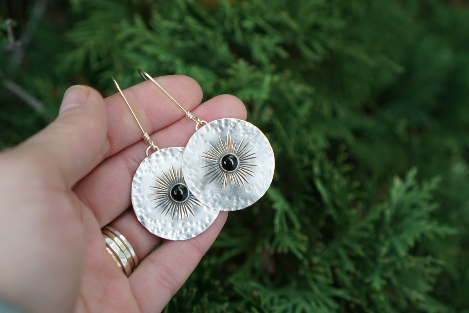 Gorgeous large disc earrings featuring richly colored little Red Jasper gemstones. These are heavily textured and every line is individually hand stamped with lots of love creating a pretty little starry night sunburst design. These earrings are light and comfy, and are simple but bold all at the same time and measure just over 2.5 inches long. Earrings hang from extra long hand crafted earwires and are oxidzed and polished for a soft rustic finish.