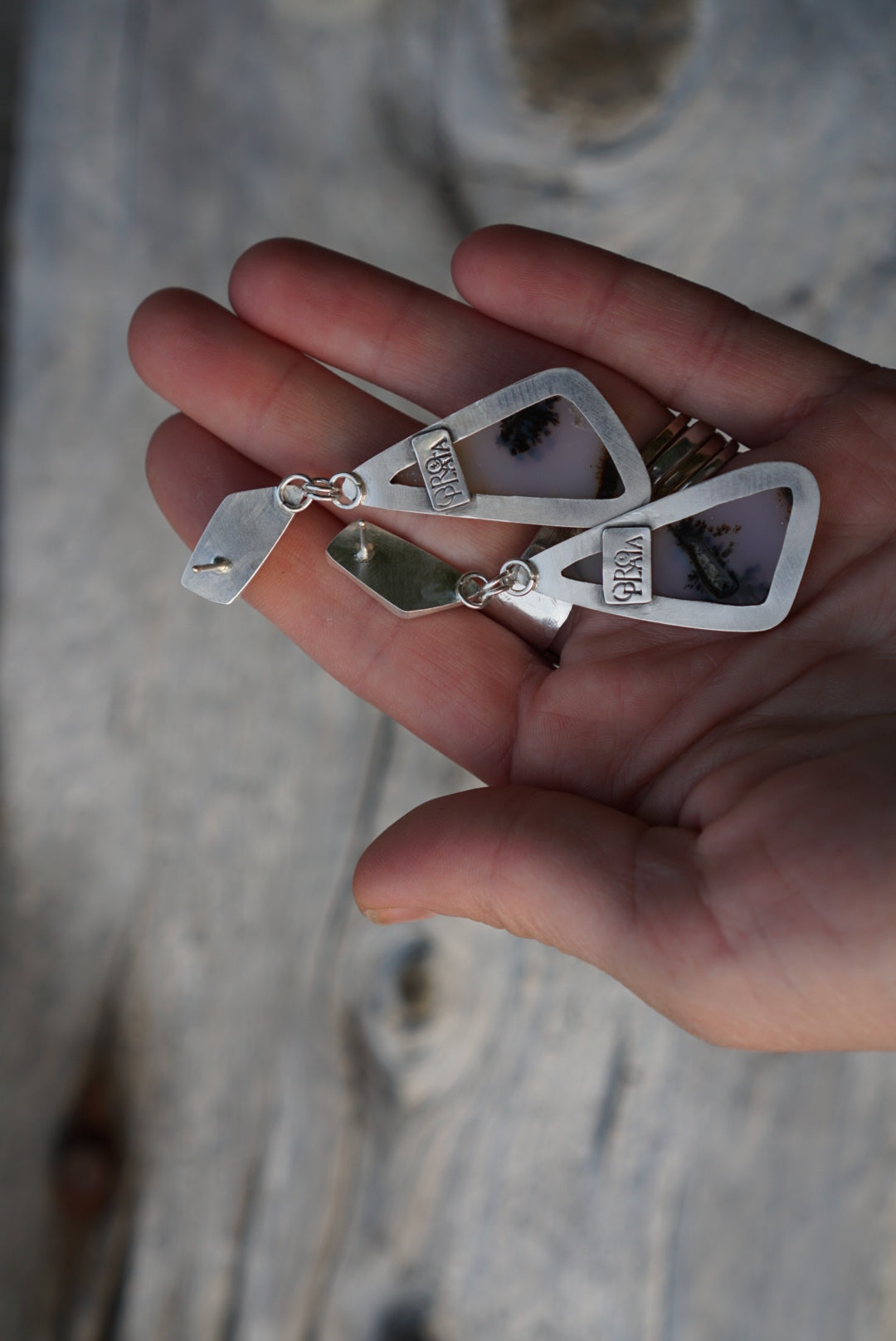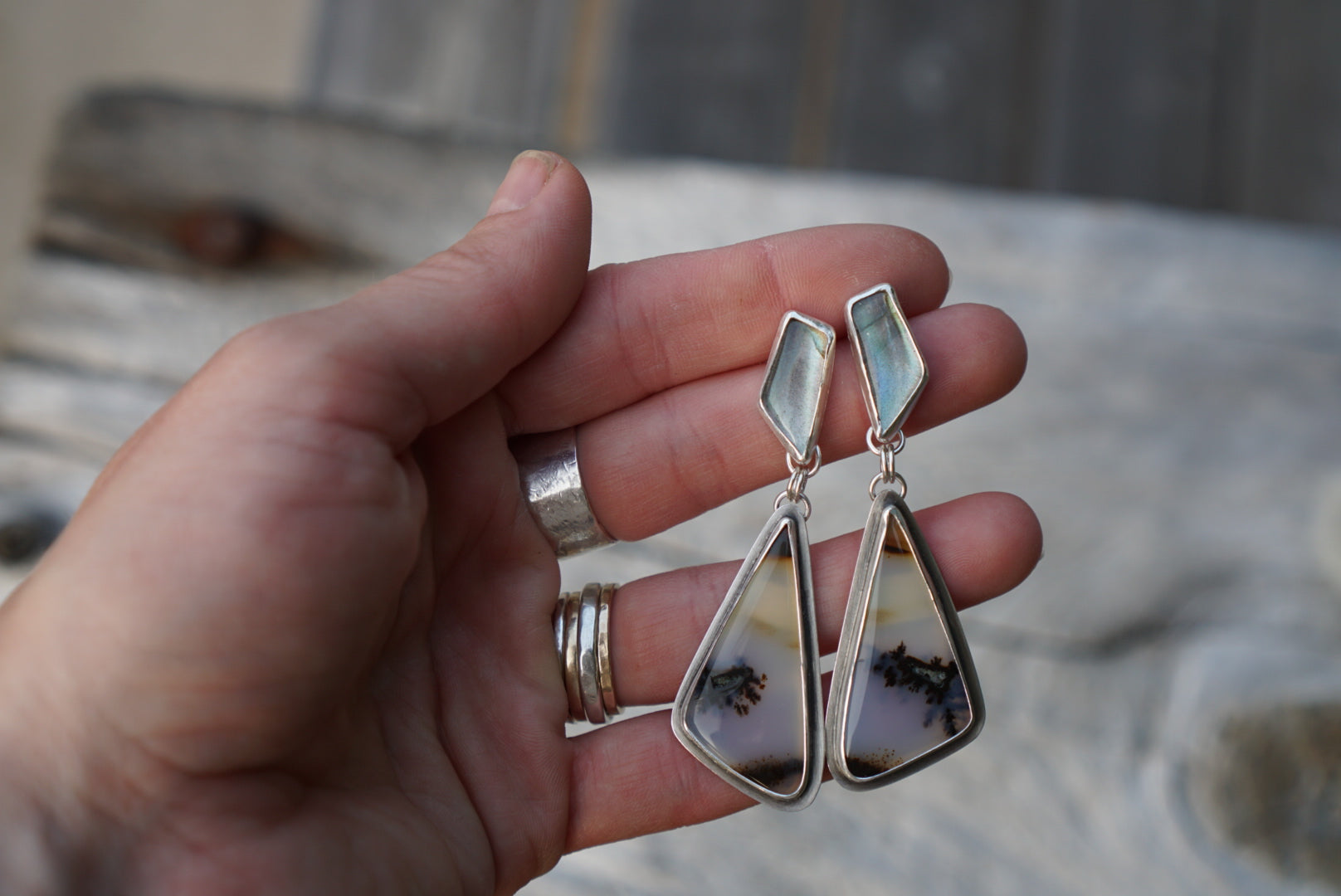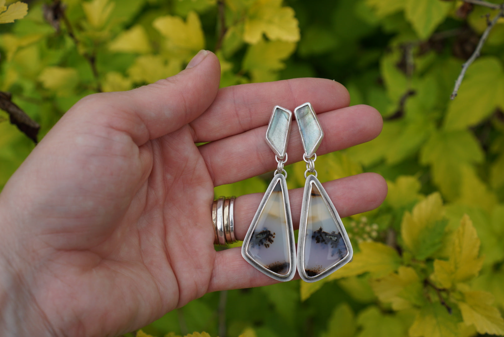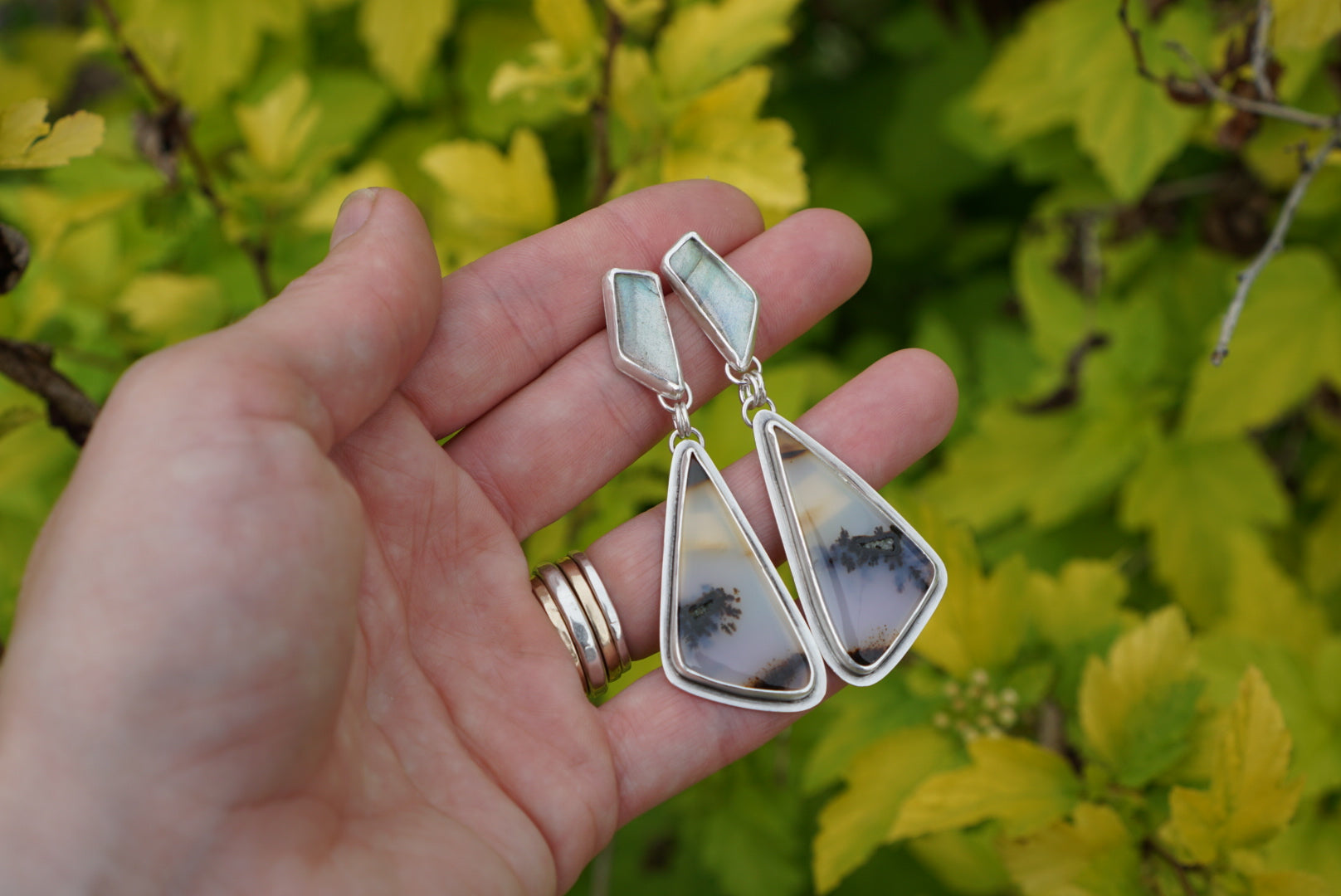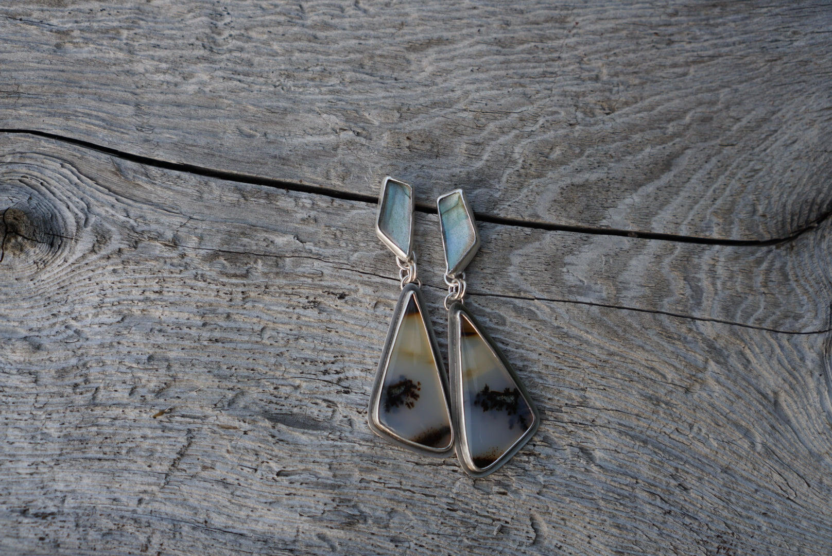 Gorgeous post earrings featuring stunning stones of flashy Labradorite and Montana Agate. These earrings feature cut out backs on the agates to let the light shine through, and they dance and swing with lots of movement. Beautiful, fun and unique. These earrings hang just over 2.5 inches long and are finished with sterling silver earwires.