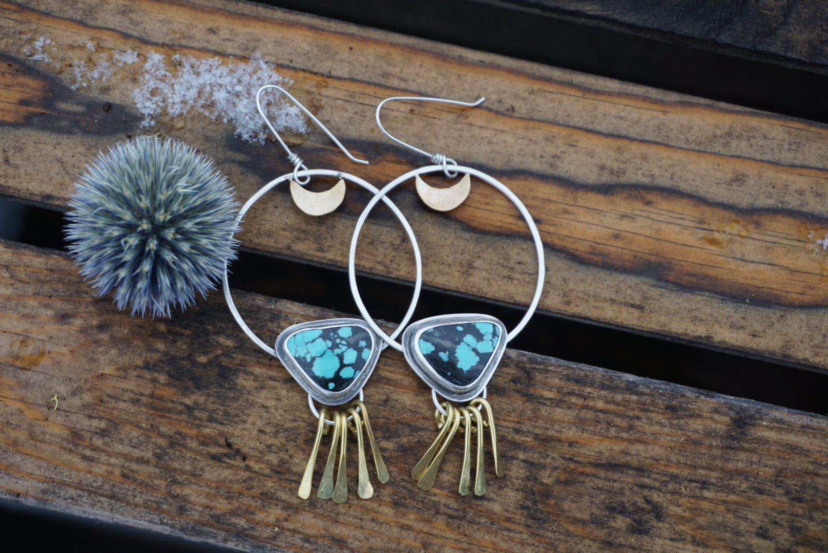 Beautiful medium sized everyday hoops featuring stunning Blue Moon Turquoise gemstones at the base and hand crafted crescent moons nestled on the upper rim of the hoops with brass fringe dancing at the bottom. Earrings are completely handmade from fine and sterling silver and a little bit of brass; they dangle from handmade sterling silver earwires. Hoops measure about 1.75 inches in diameter and hang just over 3.5 inches long.