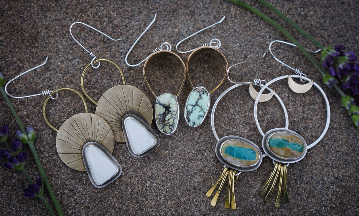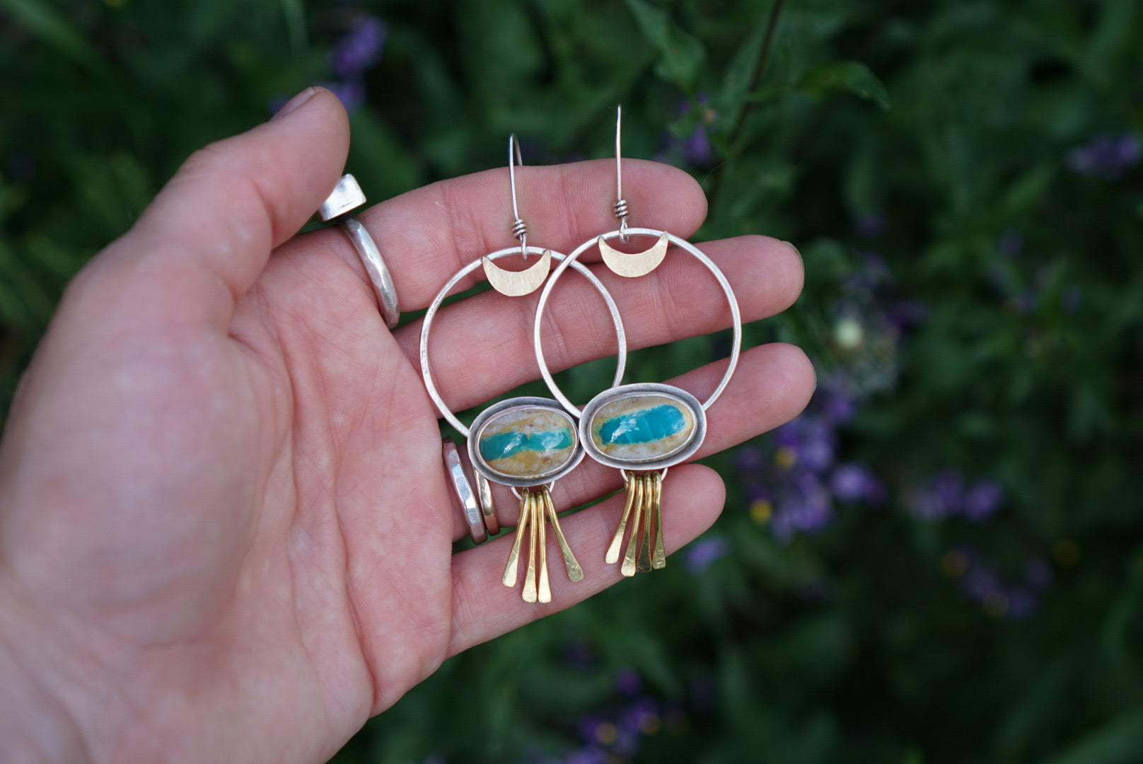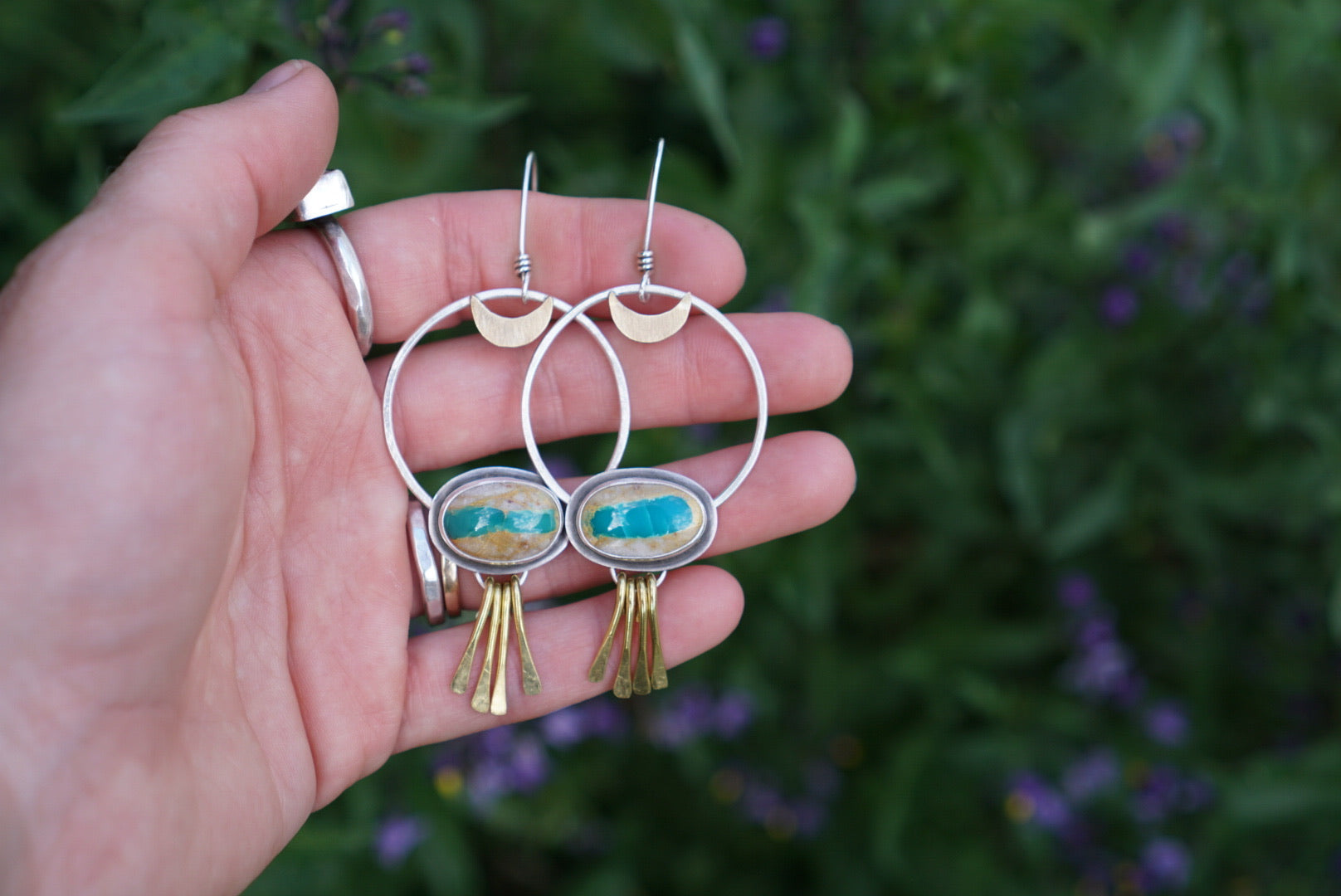 Beautiful small/medium sized everyday hoops featuring stunning earthy Royston Ribbon Turquoise gemstones at the base and hand crafted crescent moons nestled on the upper rim of the hoops with brass fringe dancing at the bottom. Earrings are completely handmade from fine and sterling silver and a little bit of brass; they dangle from handmade sterling silver earwires. Hoops measure about 1.5 inches in diameter and hang just about 3 inches long.