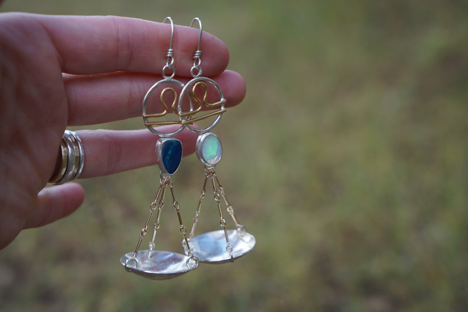 Special Libra Earrings made to resemble the scales that represent the sign. Featuring little hoops with brass libra symbols perch on them, domed silver cups dangling from 14k gold fill chain and gorgeous flashy Ethiopian and Australian Opals. Earrings hang from handmade sterling silver earwires and dangle 3.5 inches in length. All handmade, all love.