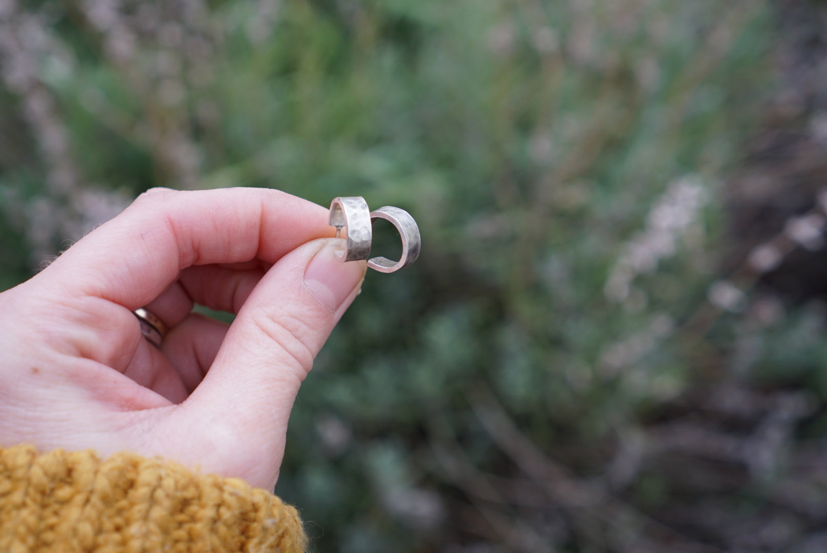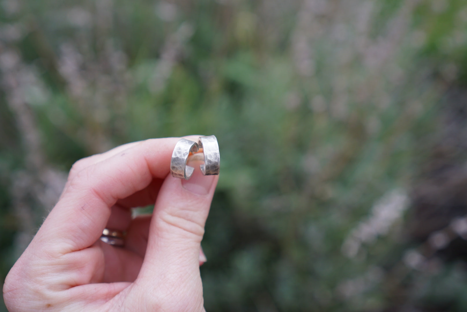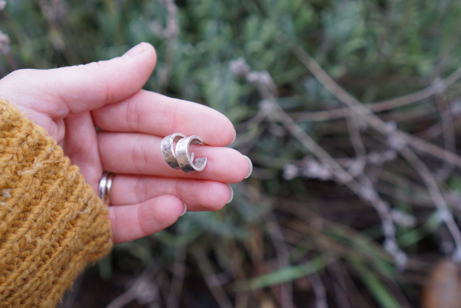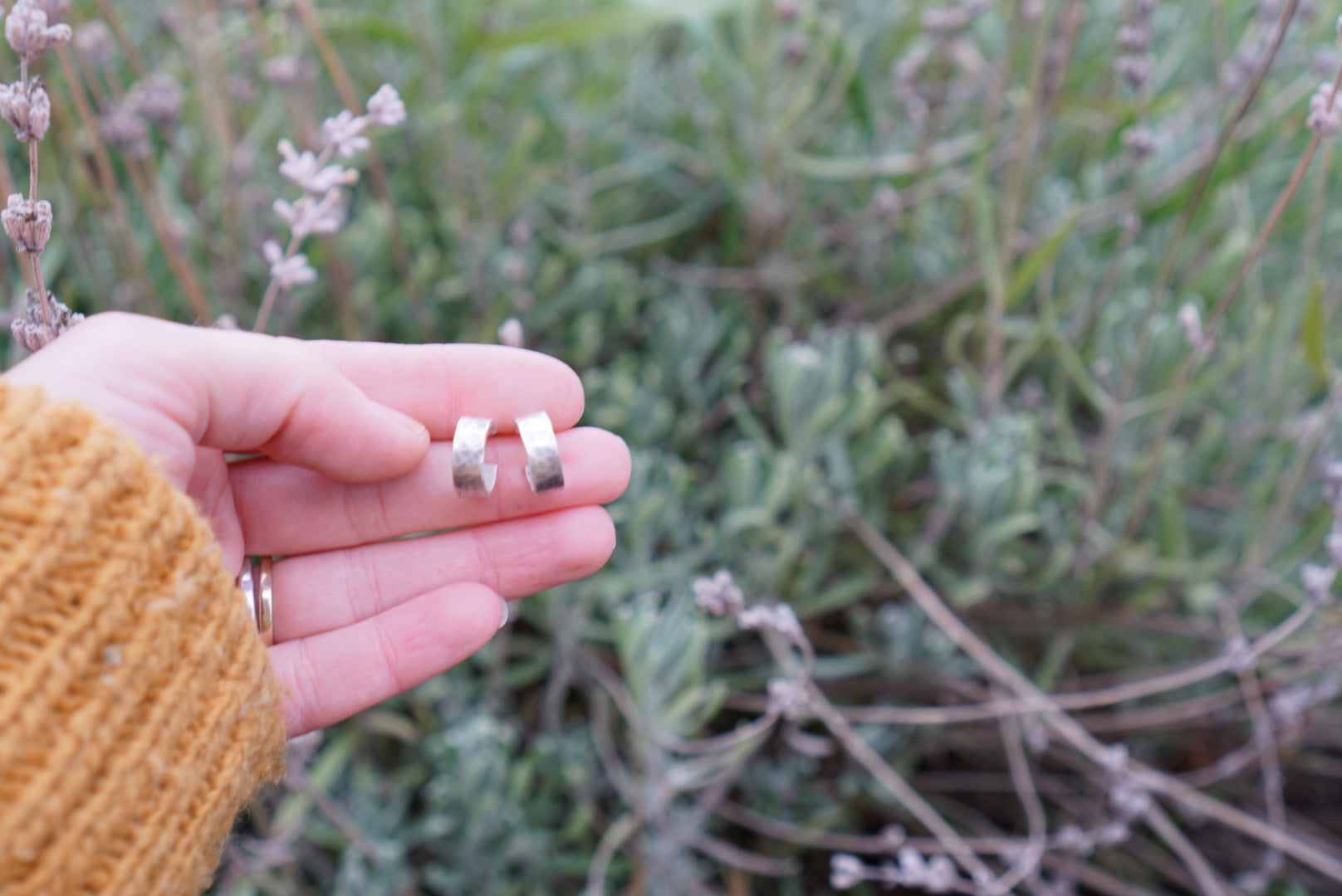 The cutest little huggie hoop earrings! Constructed of thick hammered sterling silver. Great everyday earrings and come with heavy duty ear nuts to keep em in place! Hoops measure just about .5 inches in diameter.