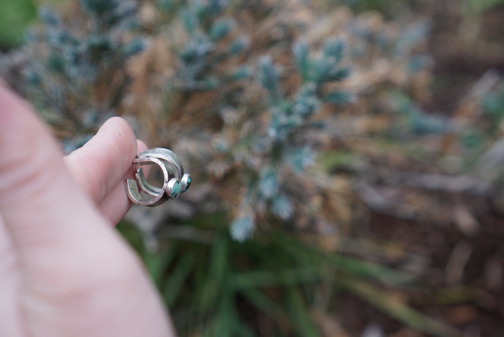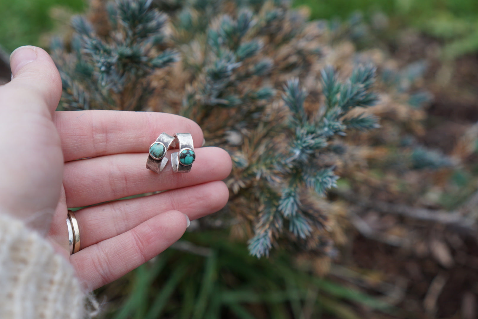 The cutest little huggie hoop earrings! Constructed of thick hammered sterling silver with small round gemstones perched on the curve. This pair features beautiful and Webbed Turquoise. Great everyday earrings and come with heavy duty ear nuts to keep em in place! Hoops measure just over .5 inches in diameter.