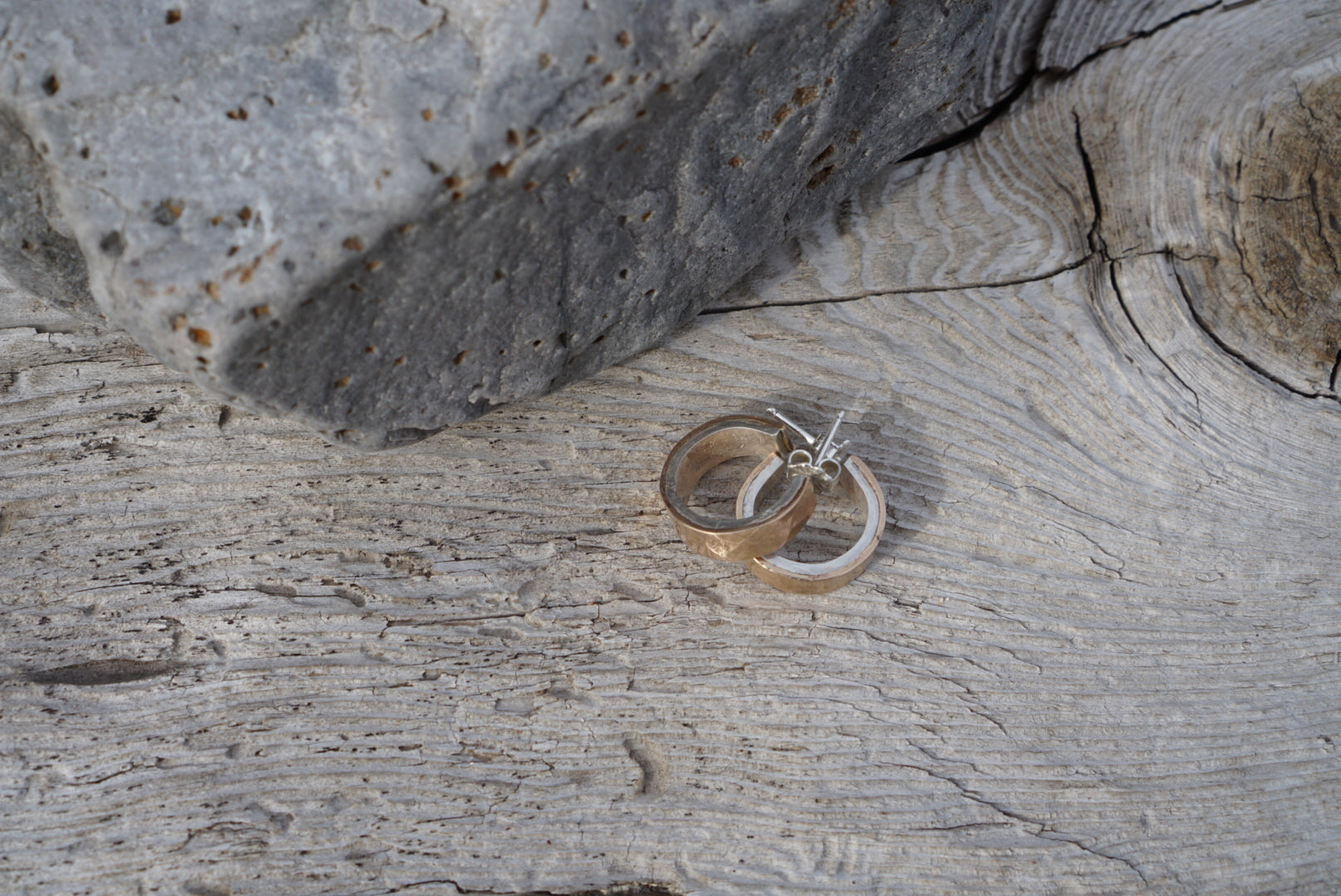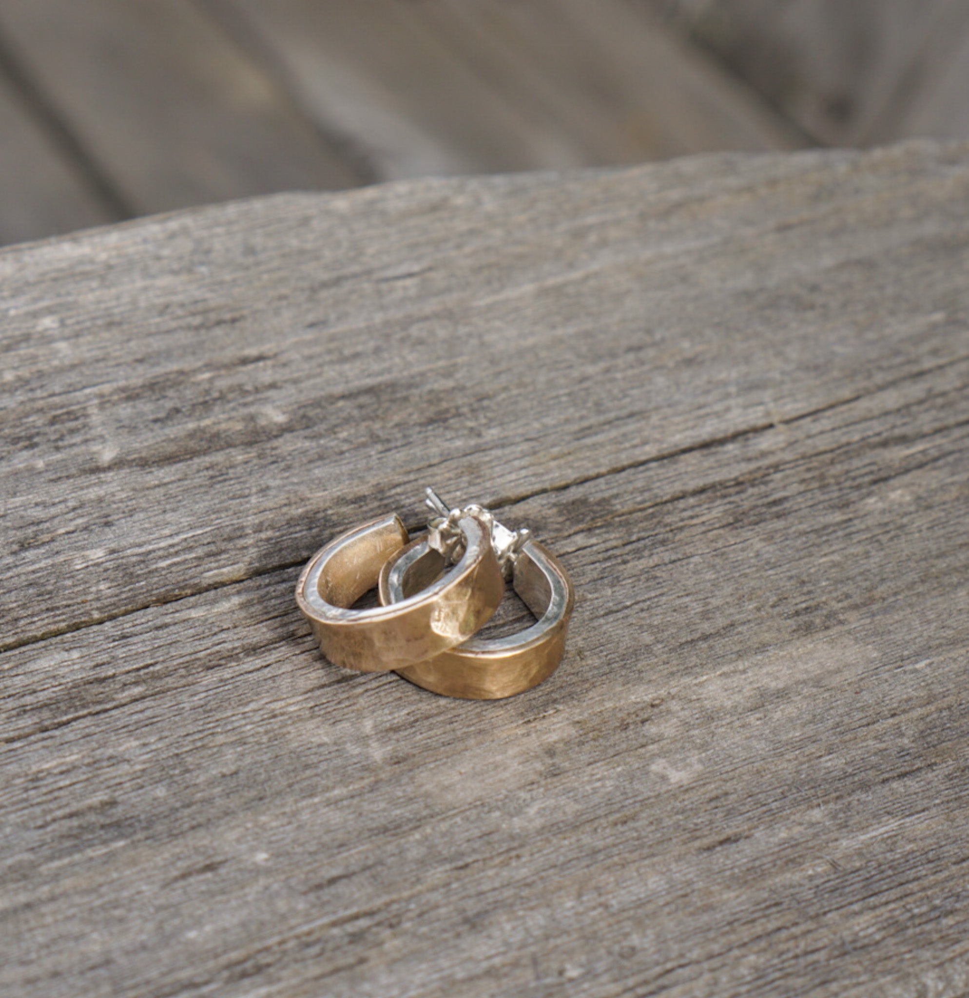 The cutest little huggie hoop earrings! Constructed of thick sterling silver with lightly hammered 14k Gold fill layered on top. Great everyday earrings and come with heavy duty sterling silver ear nuts to keep em in place! Hoops measure just over .5 inches in diameter.