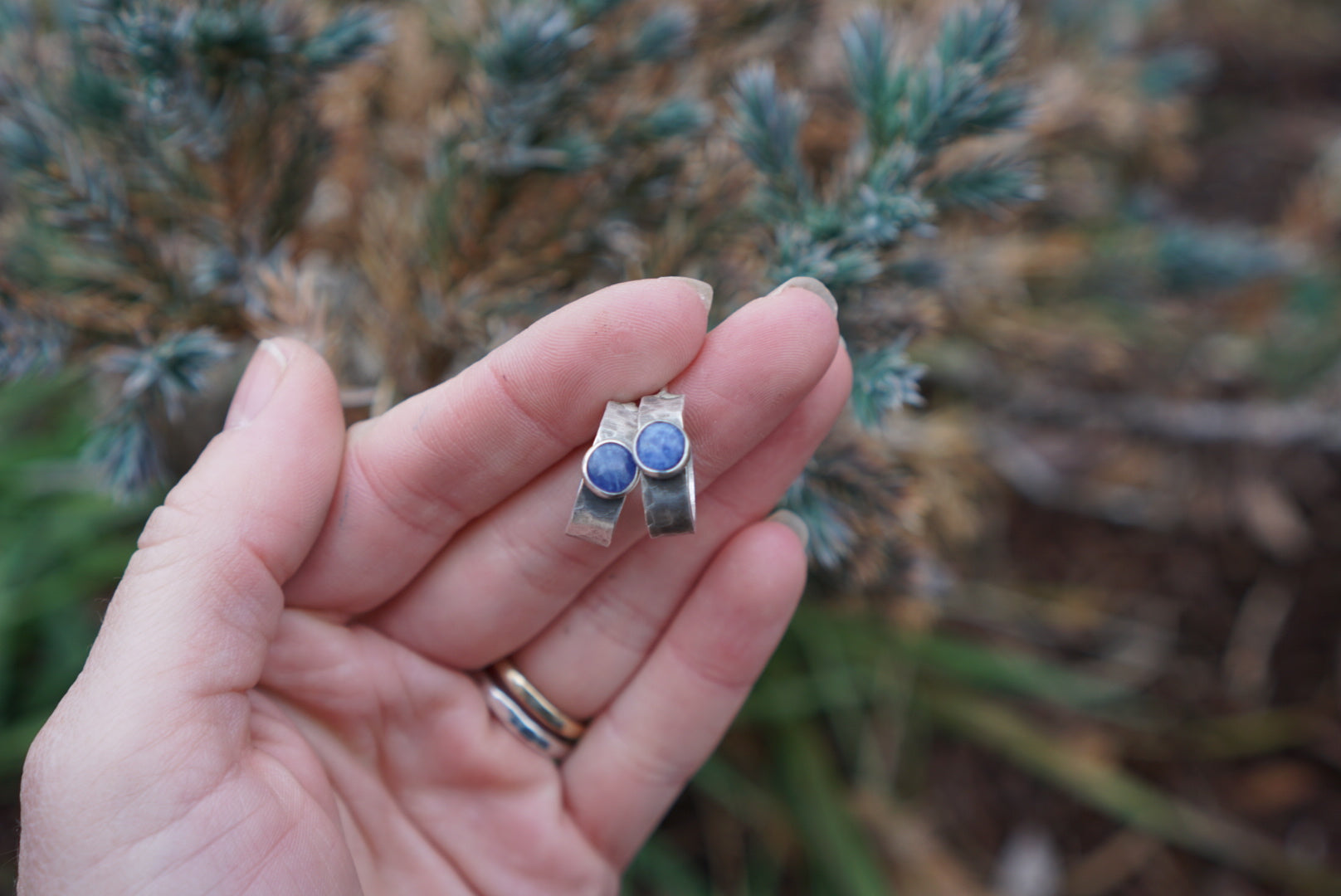 The cutest little huggie hoop earrings! Constructed of thick hammered sterling silver with small round gemstones perched on the curve. This pair features beautiful and dusty Blue Sodalite. Great everyday earrings and come with heavy duty ear nuts to keep em in place! Hoops measure just over .5 inches in diameter.