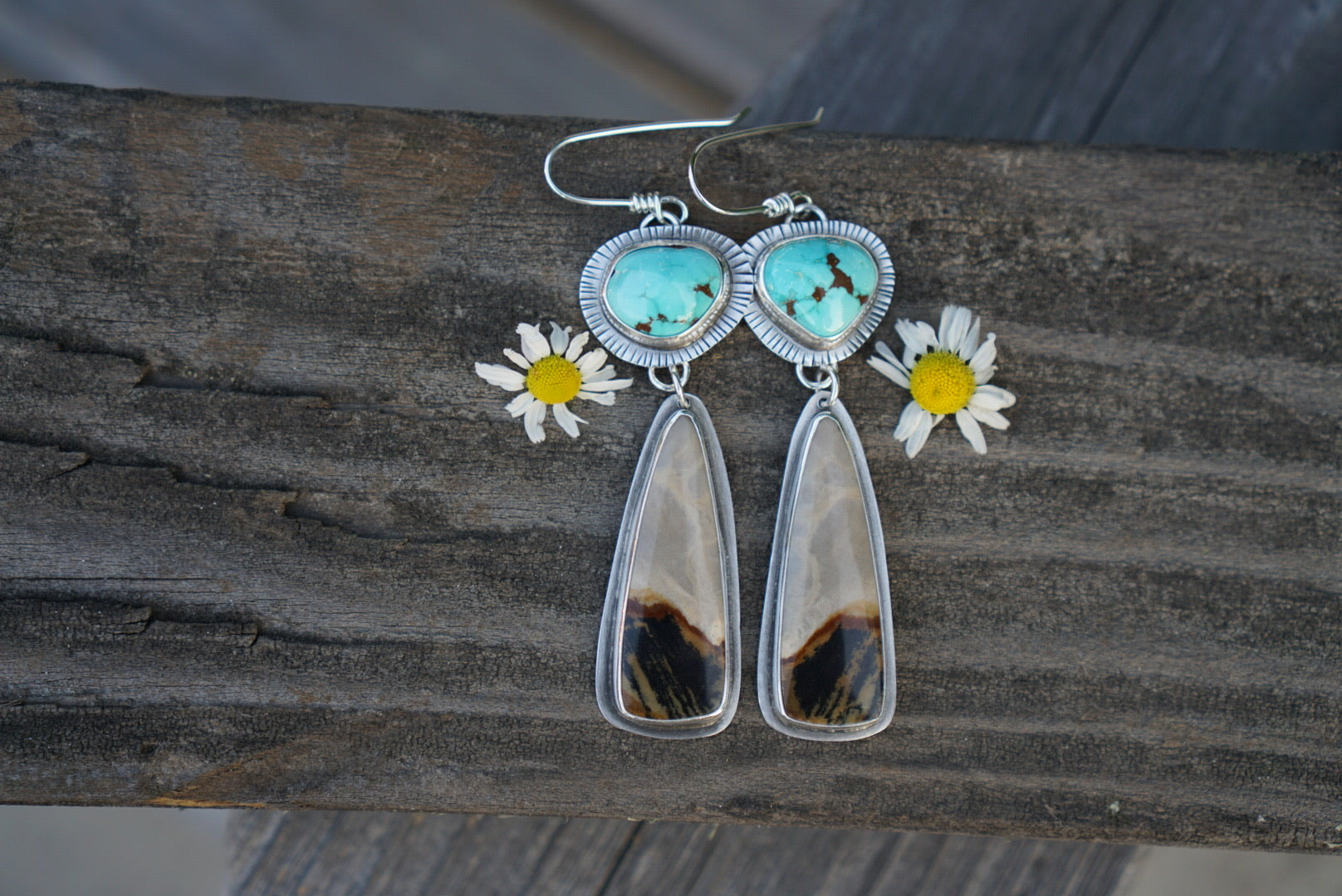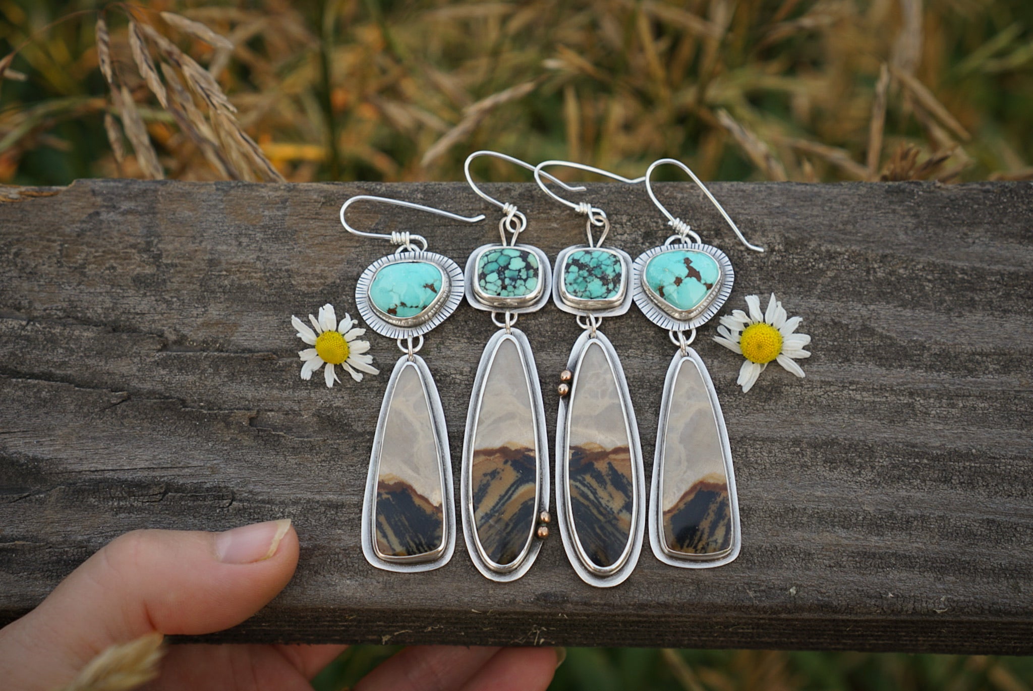 Beautiful earrings featuring amazing Carico Lake Turquoise nestled in sterling silver, below dangle slices amazing desert canyon and earthy picture jasper wrapped in fine and sterling silver. The back is cut out to show more of the stones detail and to make these a bit lighter on the ears. These jasper slices are some of the prettiest I’ve seen with amazing landscapes. Lovely contrast and compliment. Earrings are finished with hand crafted sterling silver earwires and dangle just under 3.25 inches in length.