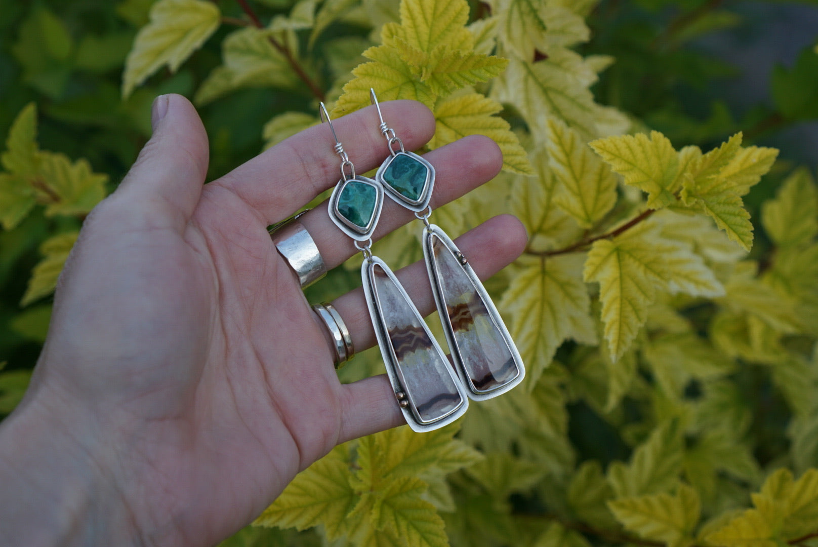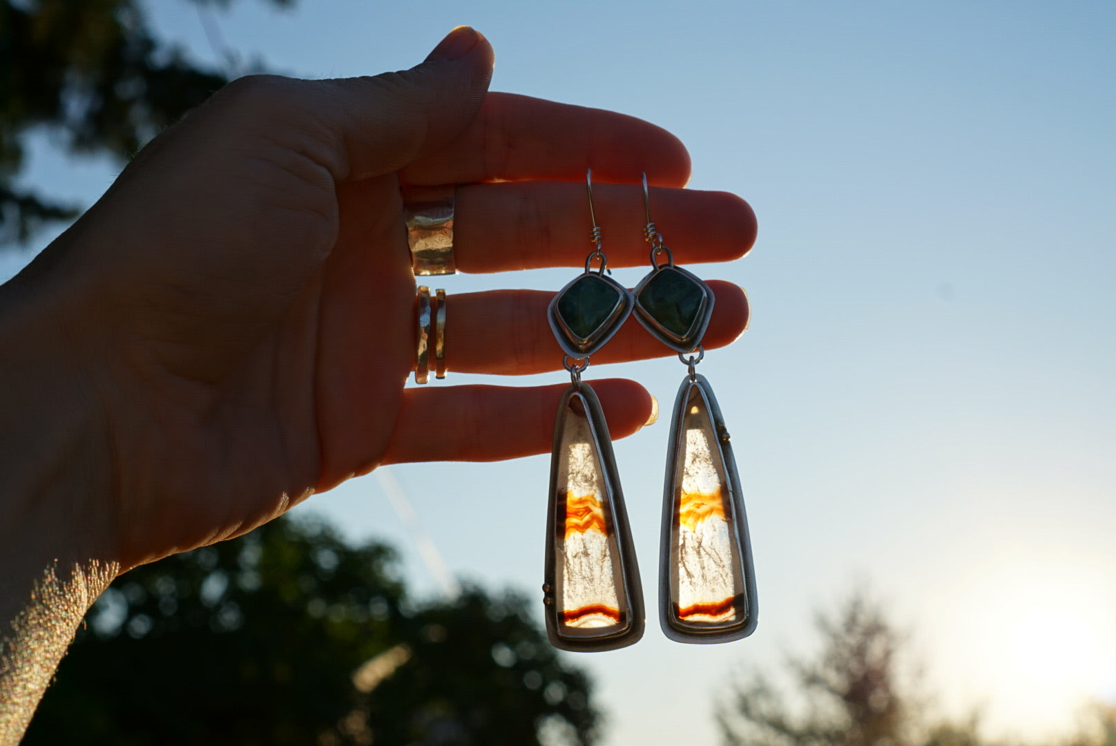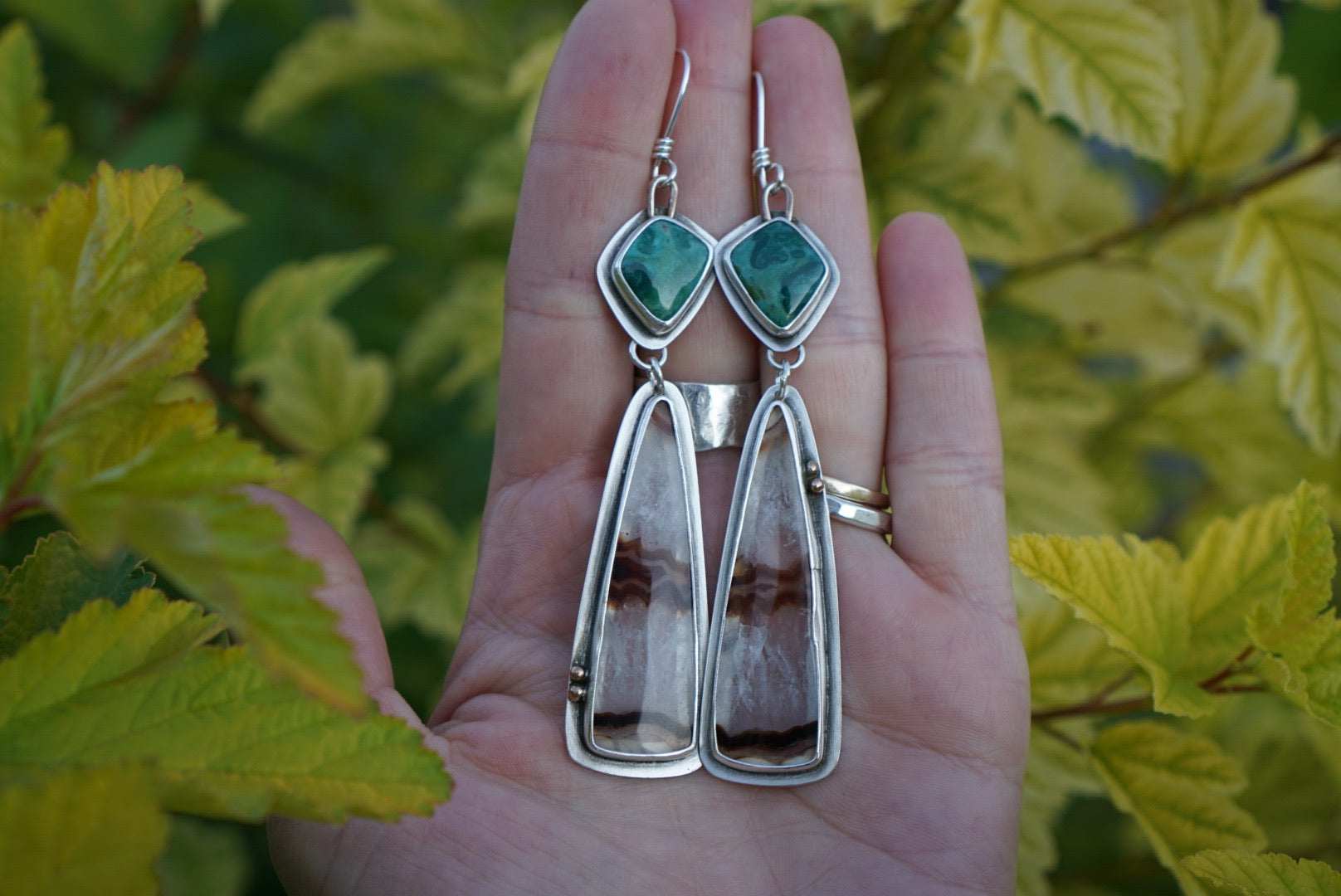 Beautiful earrings featuring amazing deep green Fox Turquoise nestled in sterling silver, below dangle slices of gorgeous Timor Agates wrapped in fine and sterling silver. The back is cut out to show more of the stones detail and to make these a bit lighter on the ears. These agate slices are some of the prettiest I’ve seen with amazing crystal and earthy brown stripes. This pair has gorgeous 14k gold fill details. Lovely contrast and compliment. Earrings are finished with hand crafted sterling silver earwires and dangle just about 3.5 inches in length.