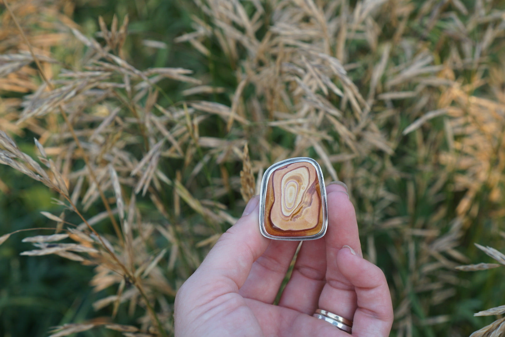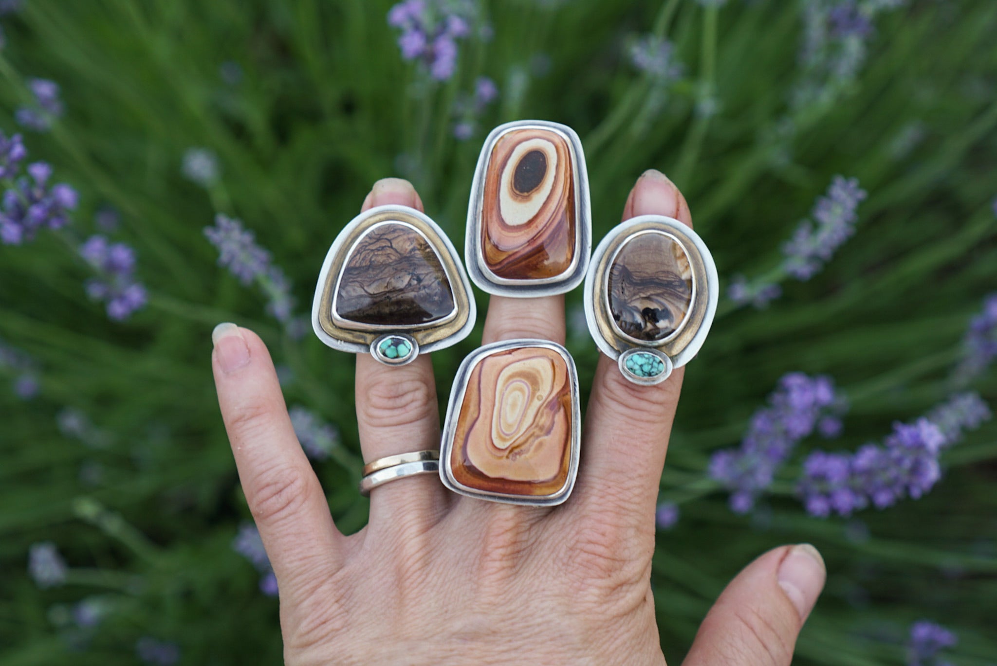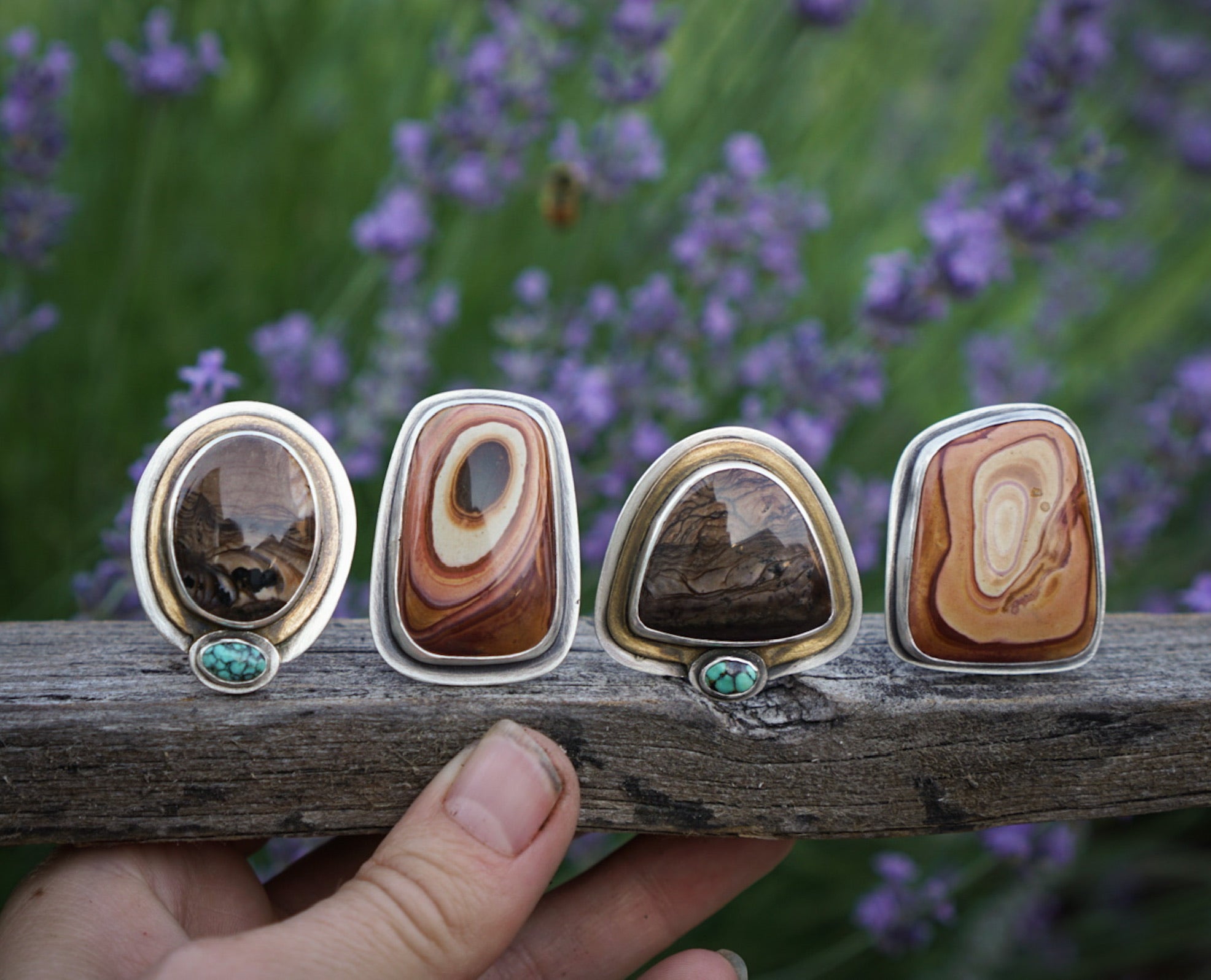 These rings are extra special to me because I made them using stones I found while on a road trip to Zion and completely Reclaimed sterling silver. This gorgeous hefty ring features a lovely slice of beautiful Utah Wonderstone simply set in reclaimed sterling silver. Oxidized and polished for a warm rustic finish. The band is wide and domed for comfort. This beauty will fit best a 7-7.25.