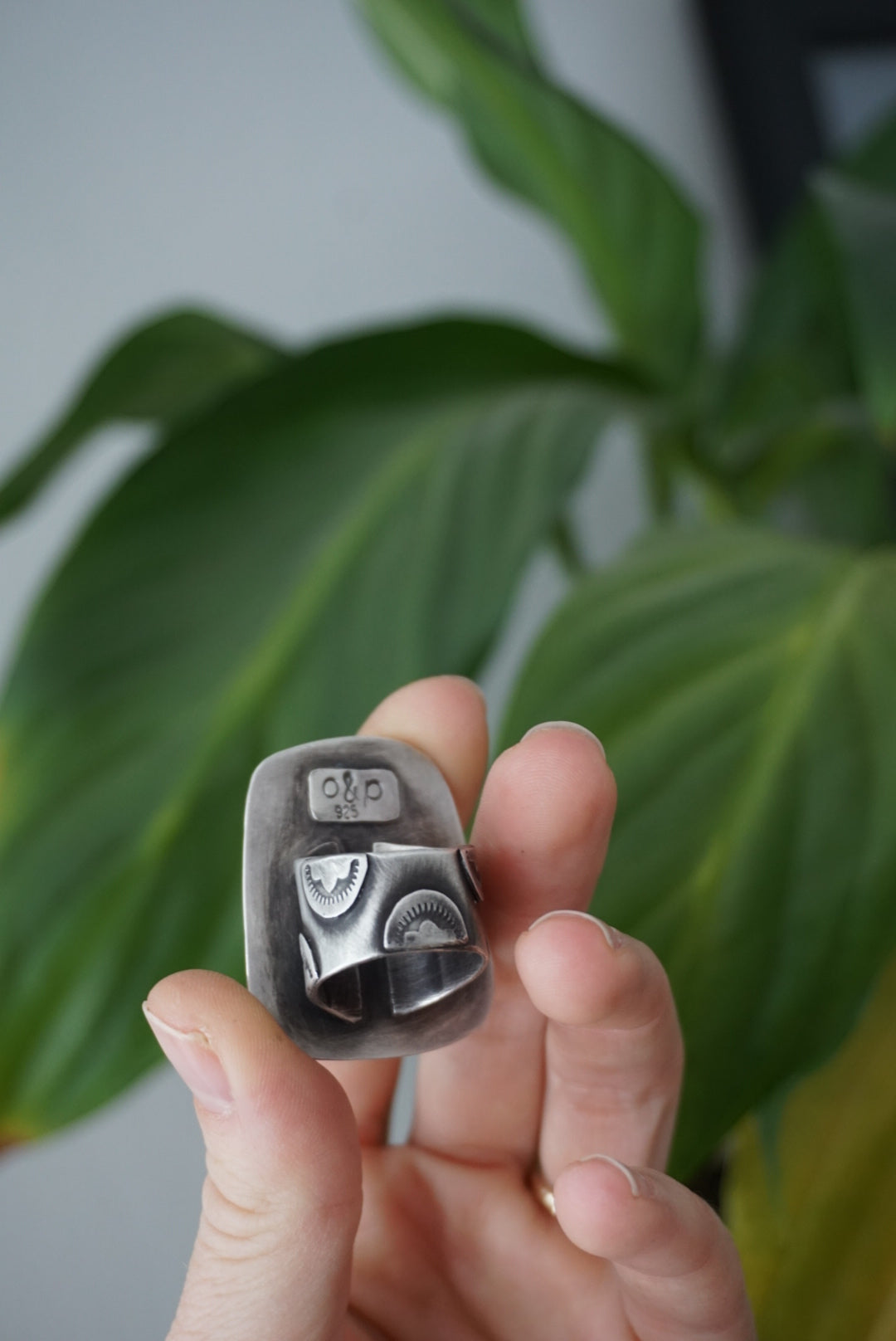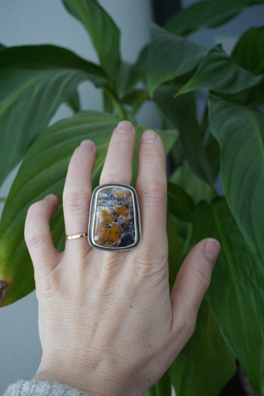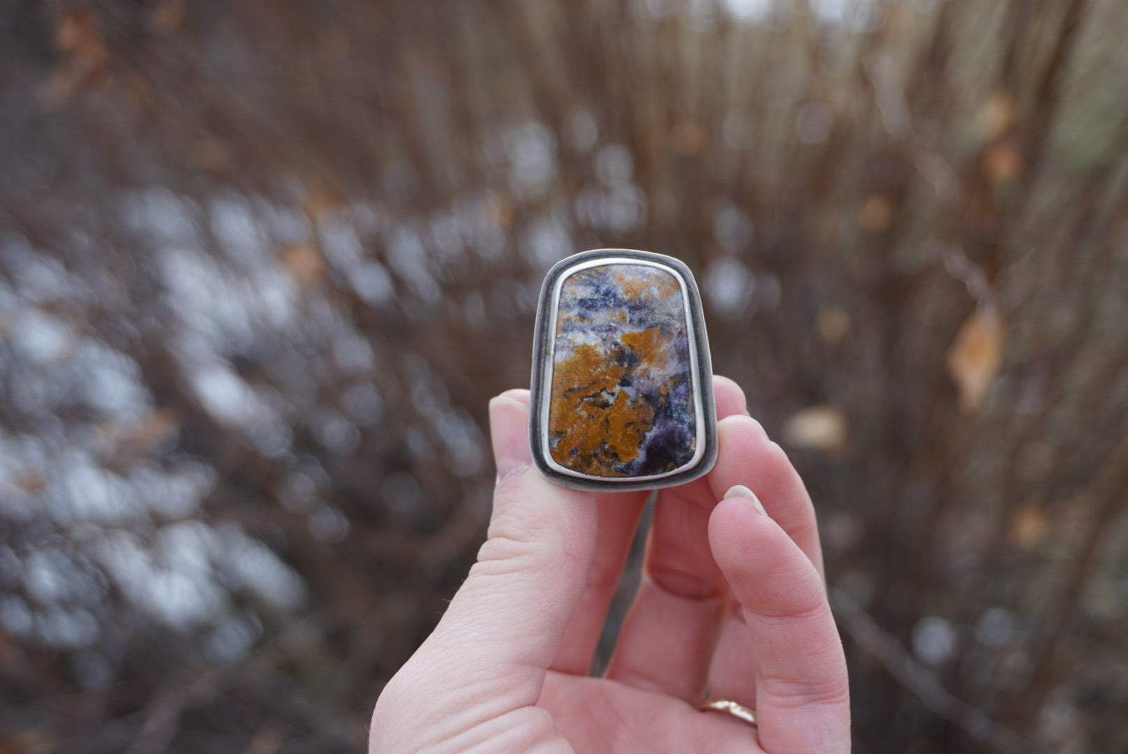 This gorgeous hefty ring features a gorgeous slice of Indian Blanket Jasper, it is simply set and mounted atop a sturdy layer genuine Sterling Silver. Oxidized and polished for a warm rustic finish. The band is a wide bow tie shape (wider on the sides and thinner in the back, for comfort) and made with extra thick sterling silver for weight and embellished with hand stamped, cut and soldered Southwestern appliqué detail. This beauty measures a size 7.