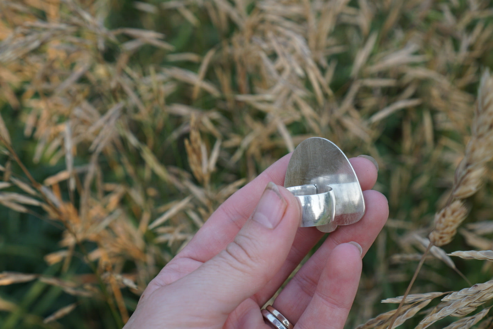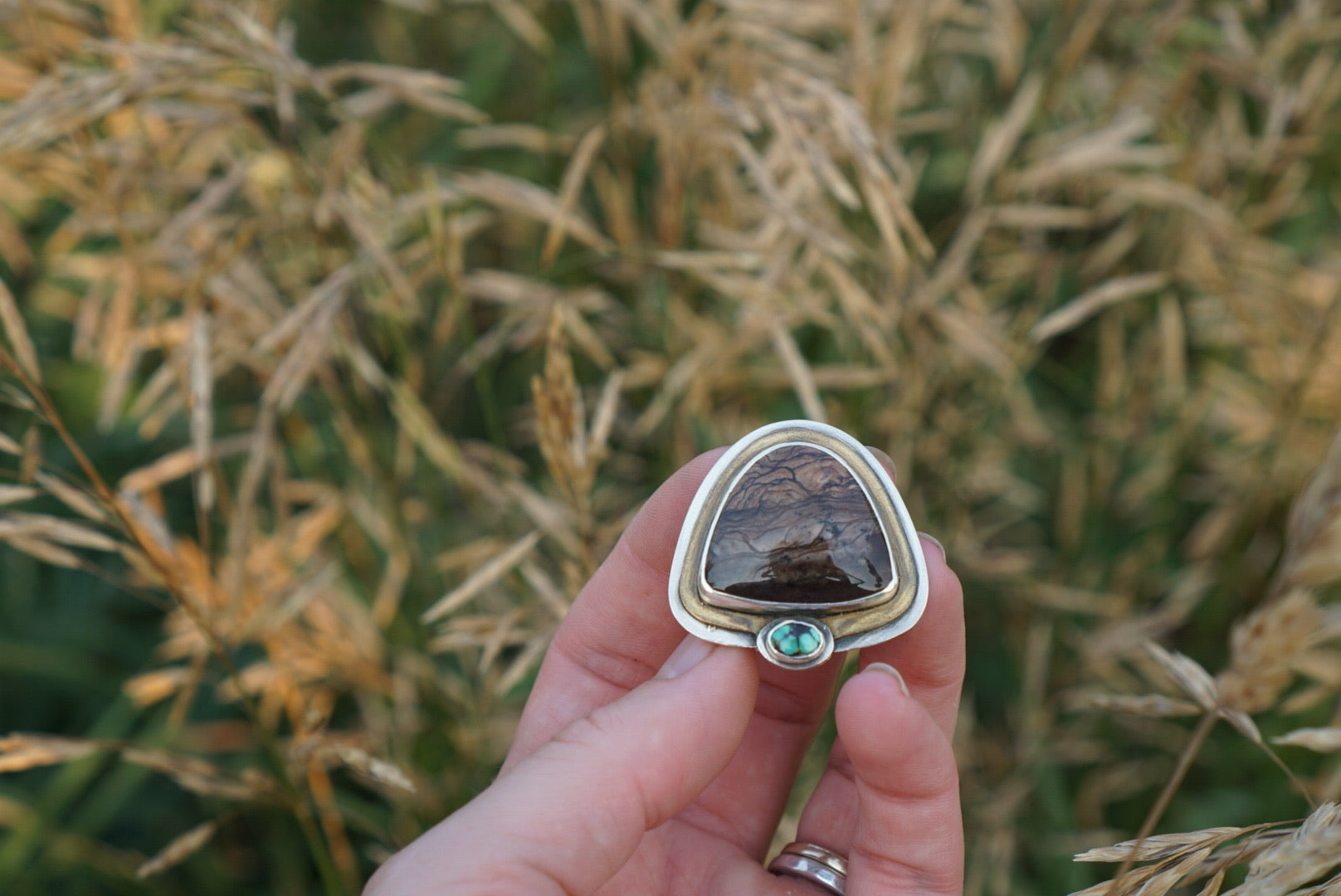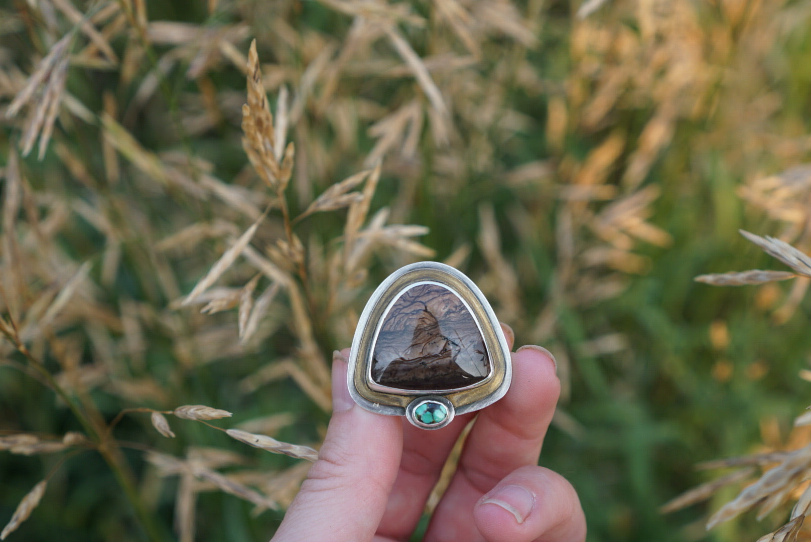 This gorgeous hefty ring features a lovely slice of beautiful Deschutes Jasper set atop a sturdy layer golden hued brass and a another sturdy layer of completely Reclaimed Sterling Silver. Nestled below is little piece of American mined turquoise. Oxidized and polished for a warm rustic finish. The band is wide and domed for comfort. This beauty will fit best a 6.25-6.5.