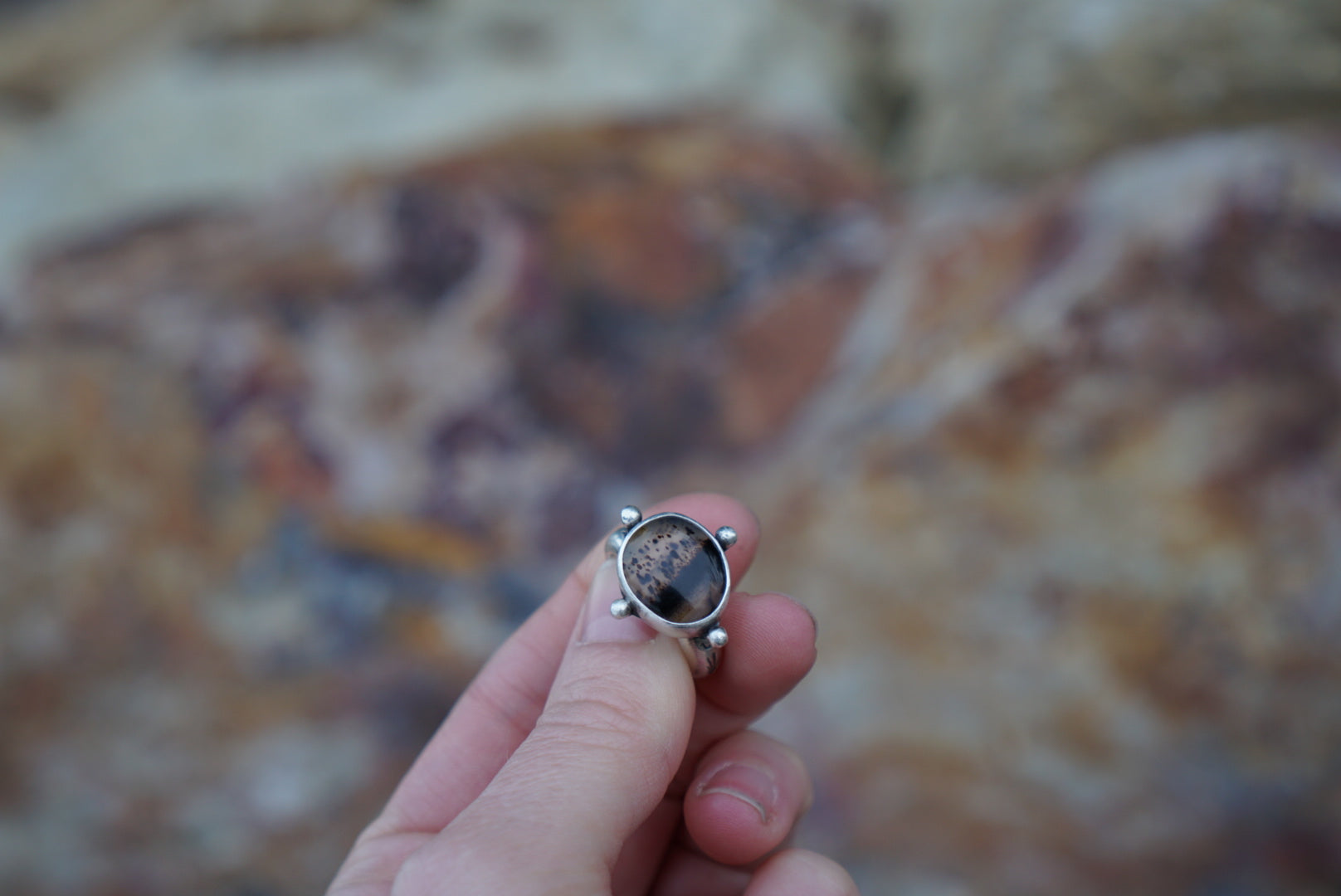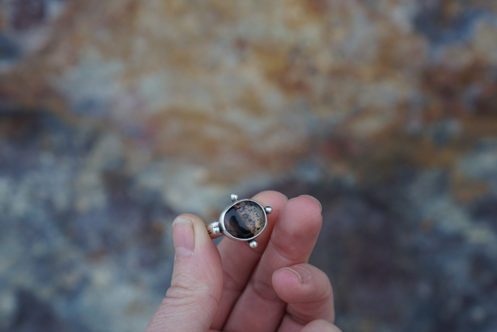 A beautiful slice of Yellowstone Montana Agate is simply set in recycled sterling silver with a four silver balls around the bezel. Finished with a simple sturdy thick half round and hand stamped ring band. A very interesting stone with dark and light browns and glowing white and honey colors, the best speckled and and earthy goodness. Ring is oxidized and polished for a soft rustic finish. Size 5.5