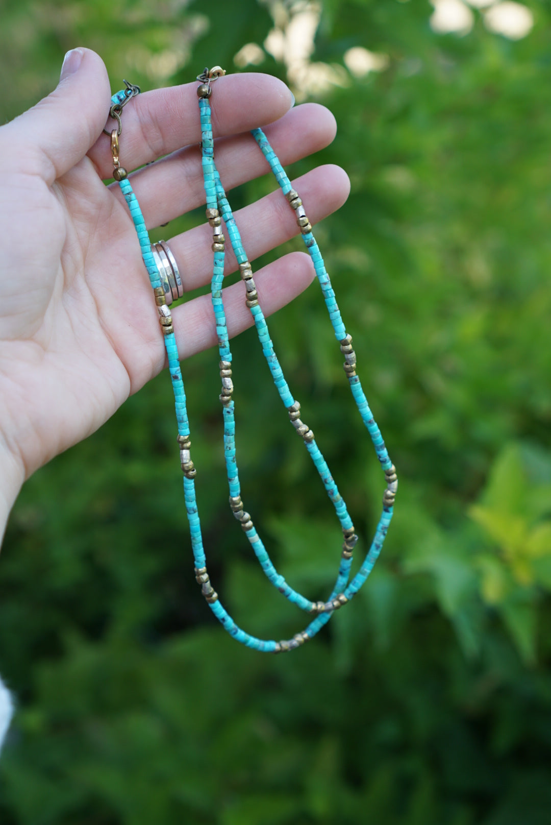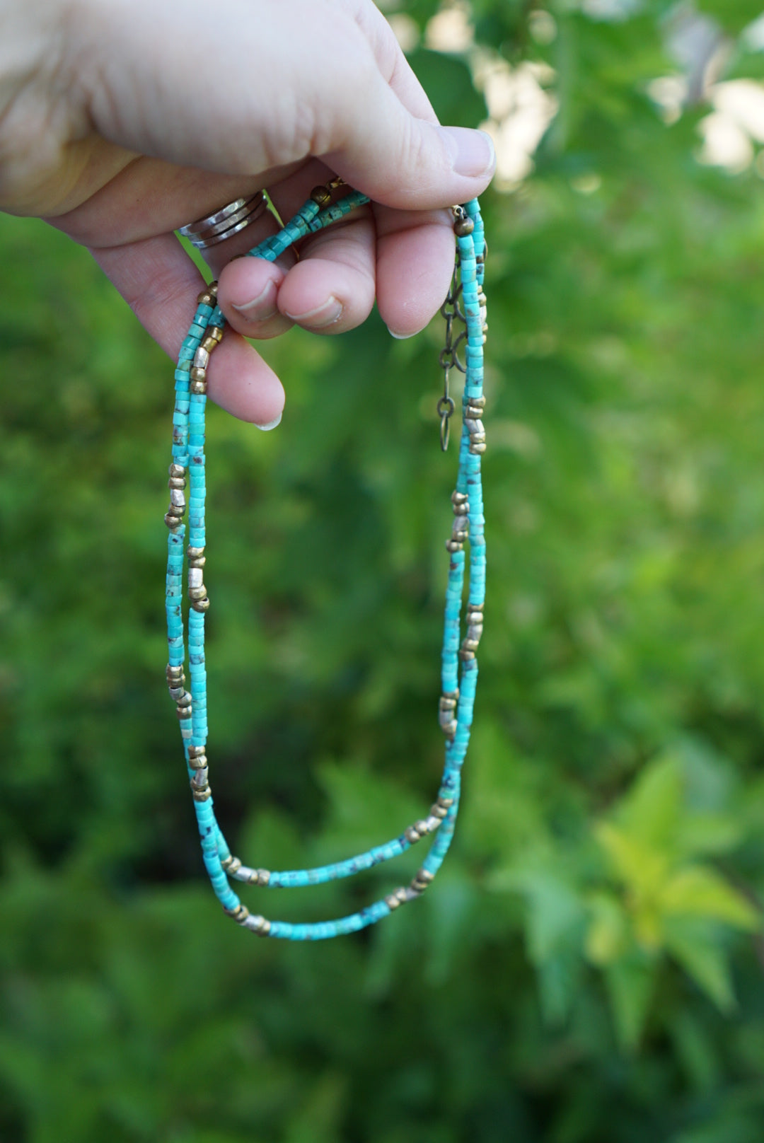 This listing is for one necklace. A beautiful layering necklace made of genuine turquoise beads and metal African trade beads. Finished with a lobster clasp and 2.5 inch extender for adjusting the length. This necklace measures 16 inches and can adjust up to 18.5 inches.