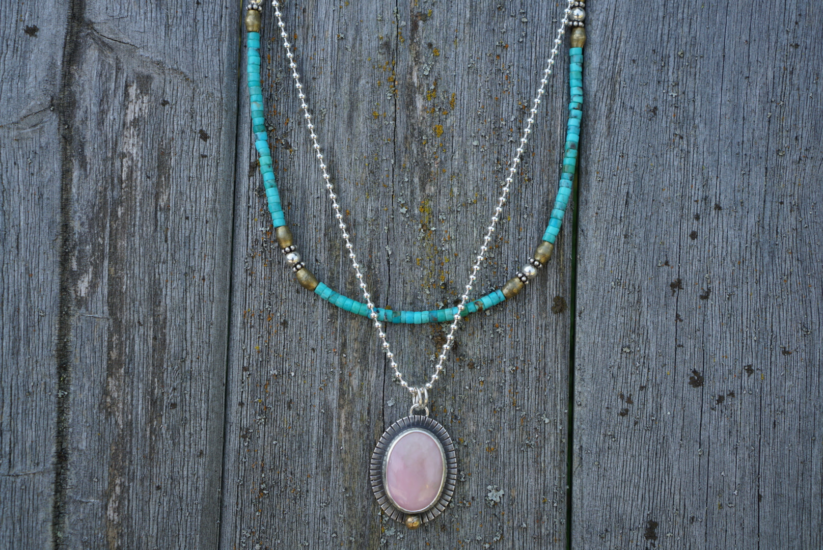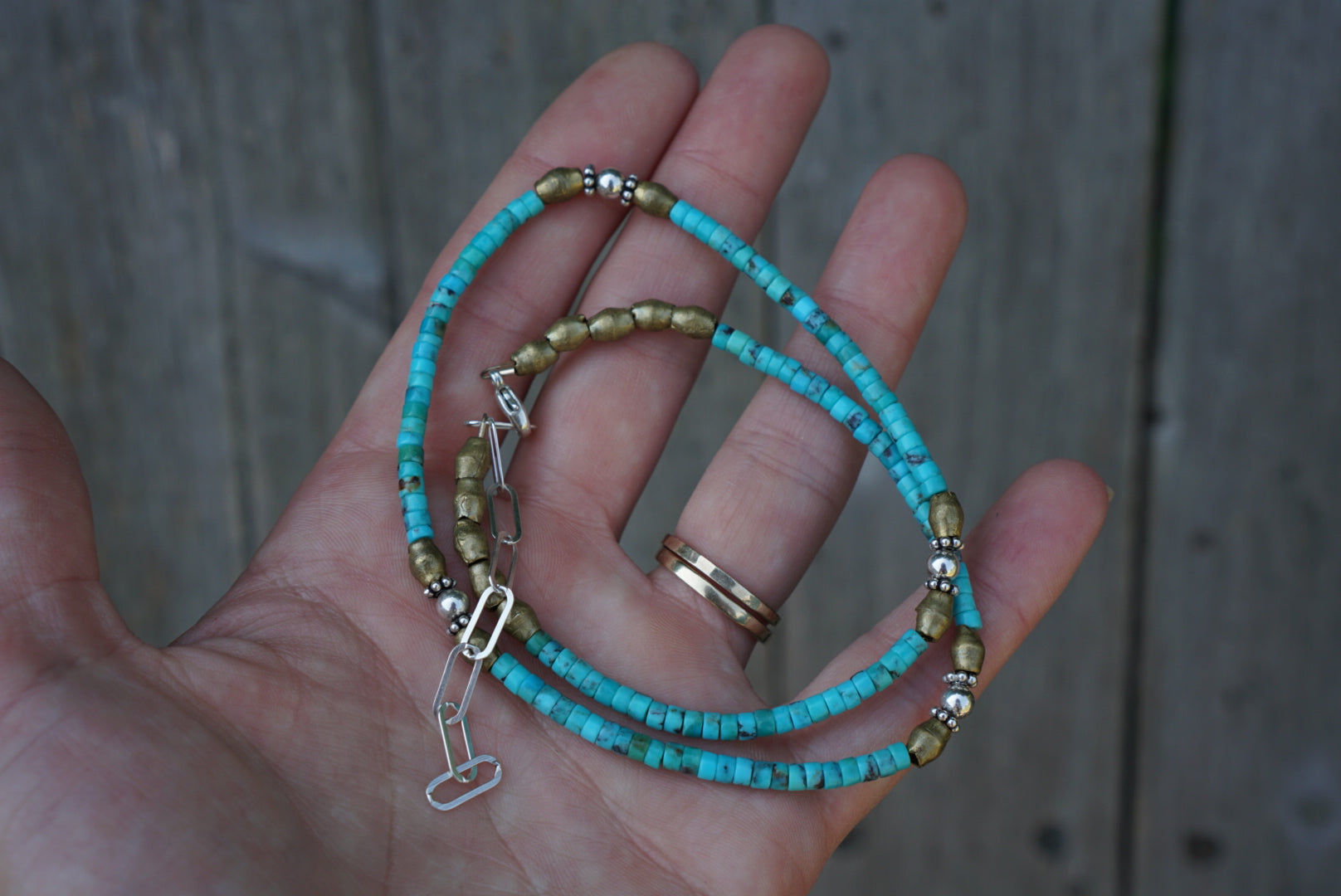 This listing is for one necklace. A beautiful layering necklace made of genuine turquoise beads and sterling silver Bali beads and brass African trade beads. Finished with a lobster clasp and 2.5 inch extender for adjusting the length. This necklace measures 15 inches and can adjust up to 17.5 inches.