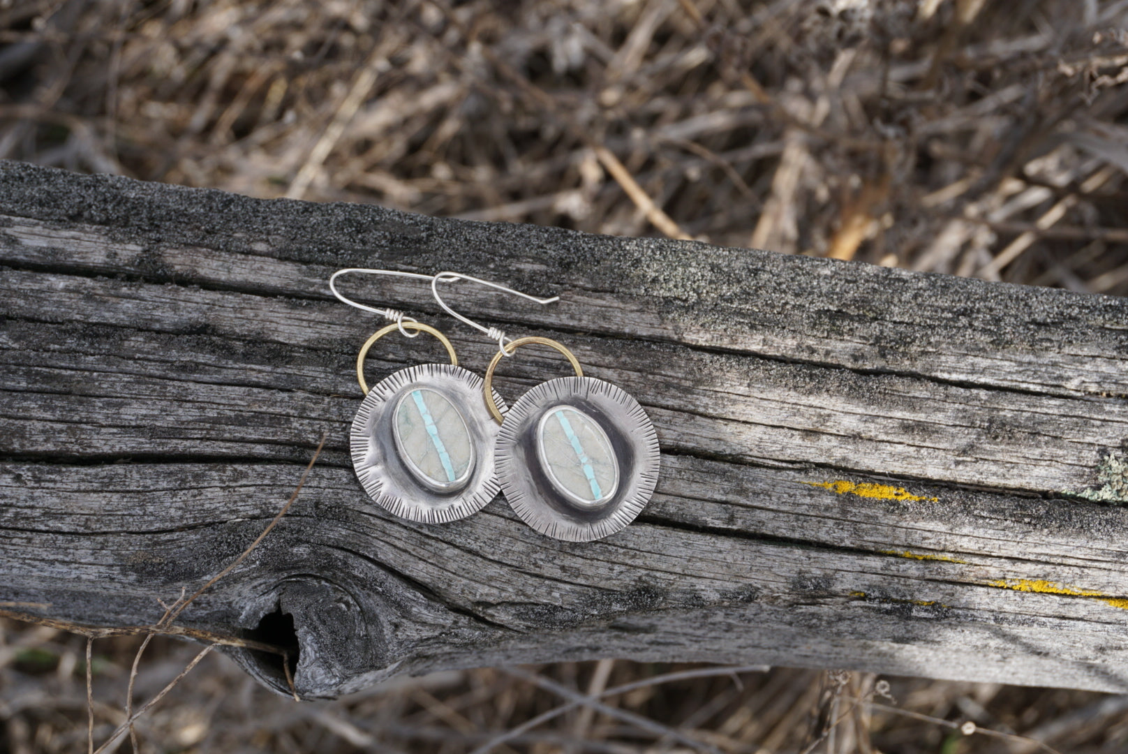 Beautiful hunks of Ribbon Turquoise are simply set atop heavily textured discs and haloed by simple brass arcs. Earrings are oxidized and polished for a soft rustic glow and dangle from handmade sterling silver earwires. Earrings measure about 2.25 inches in length.