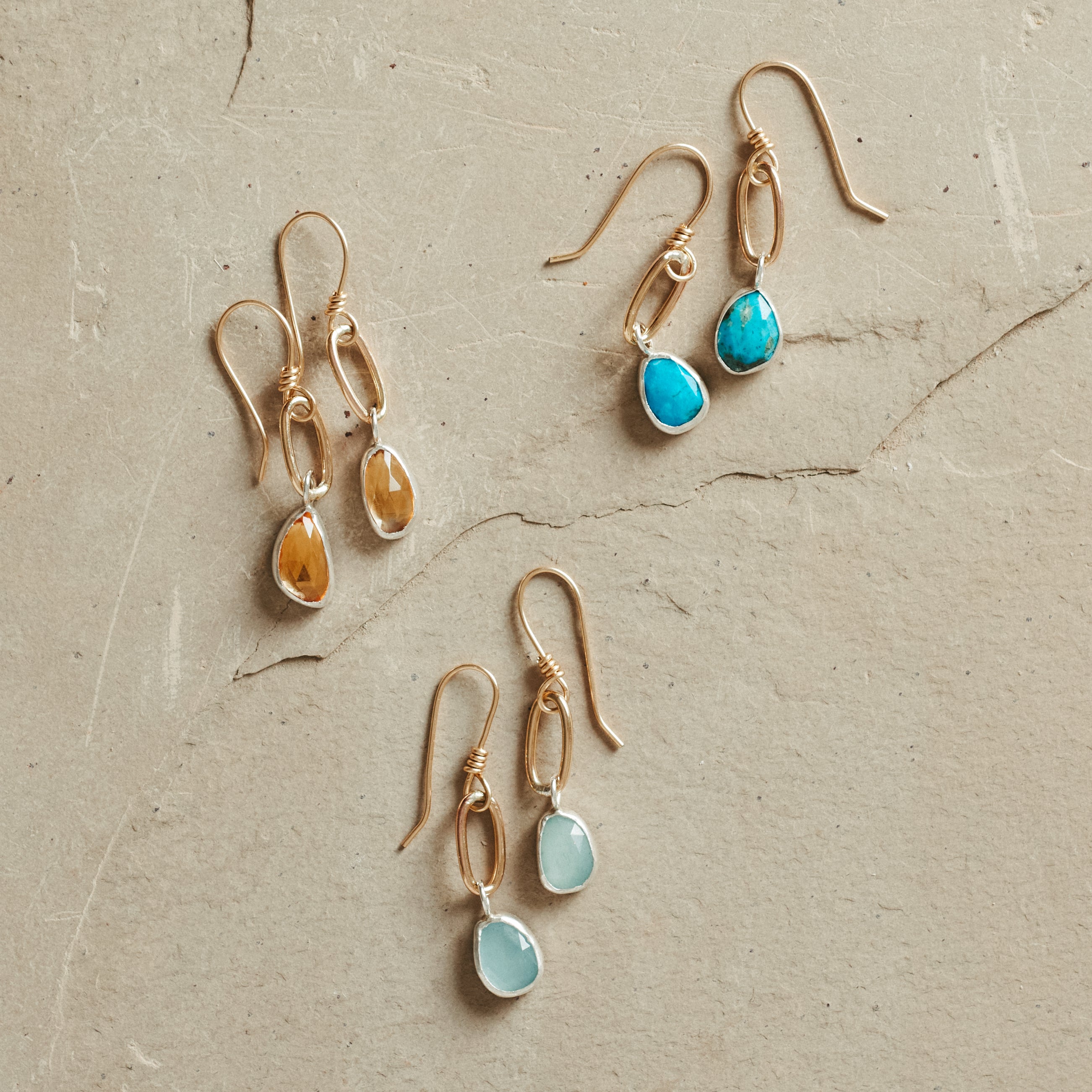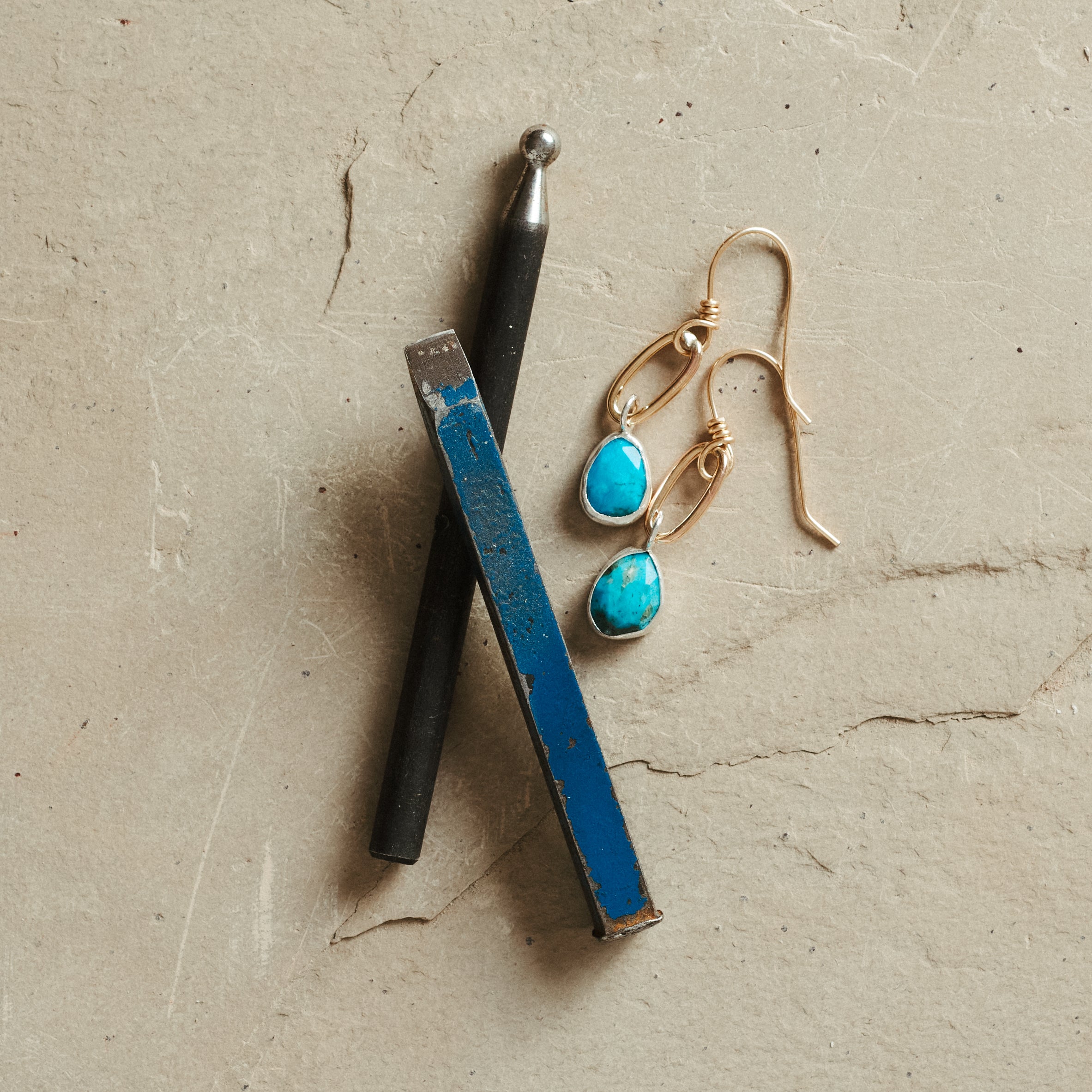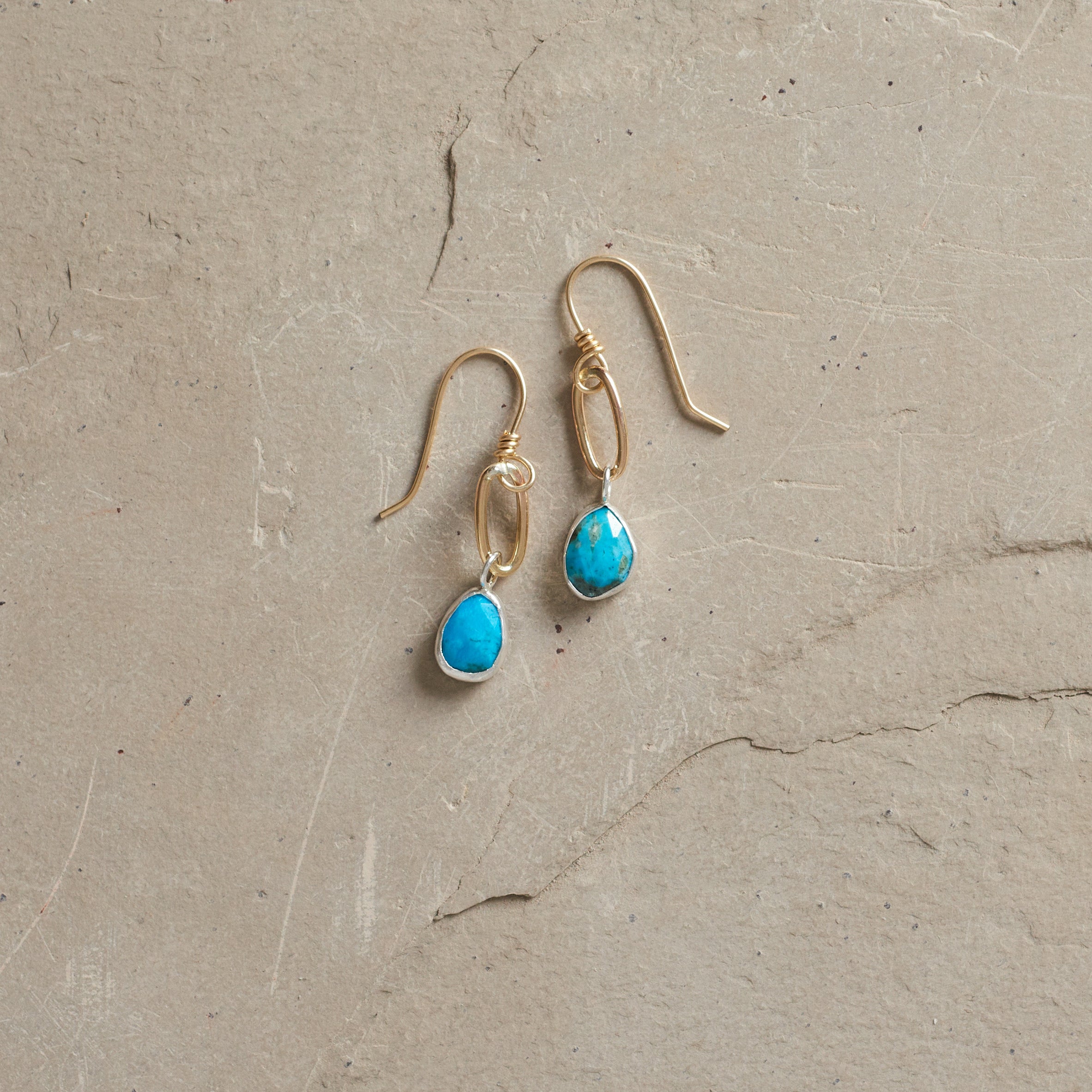 These earrings are so sweet. I love how simple they are yet they still make a little statement. Little bright blue hued rose cut Turquoise stones are wrapped in silver and dangle below little 14K gold fill links. These are a perfect staple pair of earrings, excellent for the everyday. These measure just over 1.5 inches long and are finished with handmade 14K Gold fill earwires.
