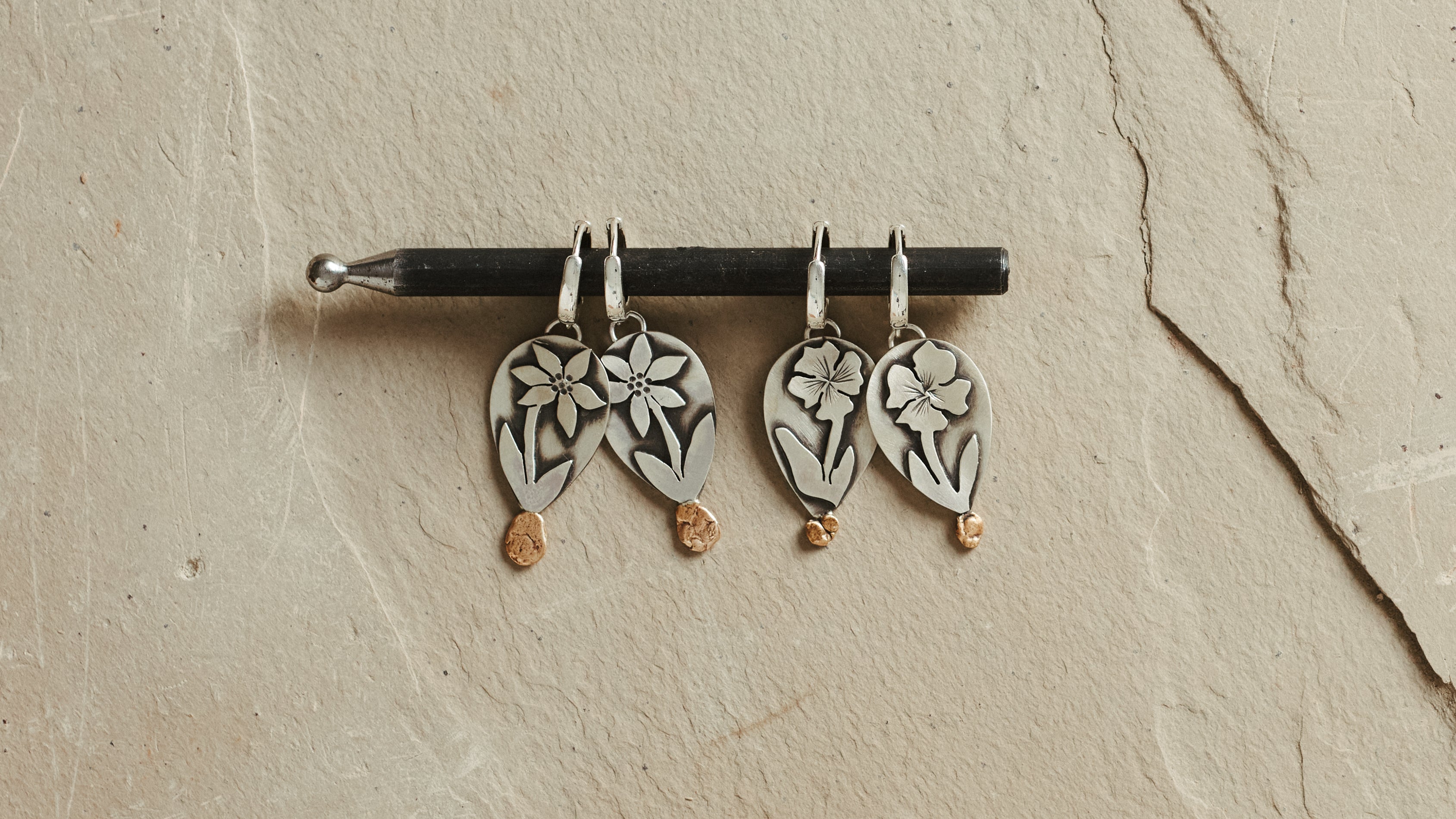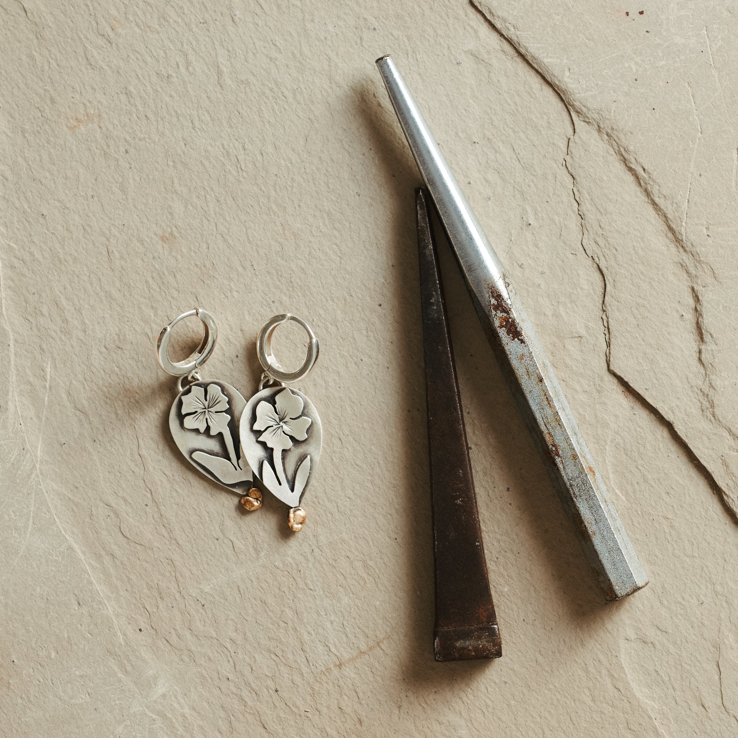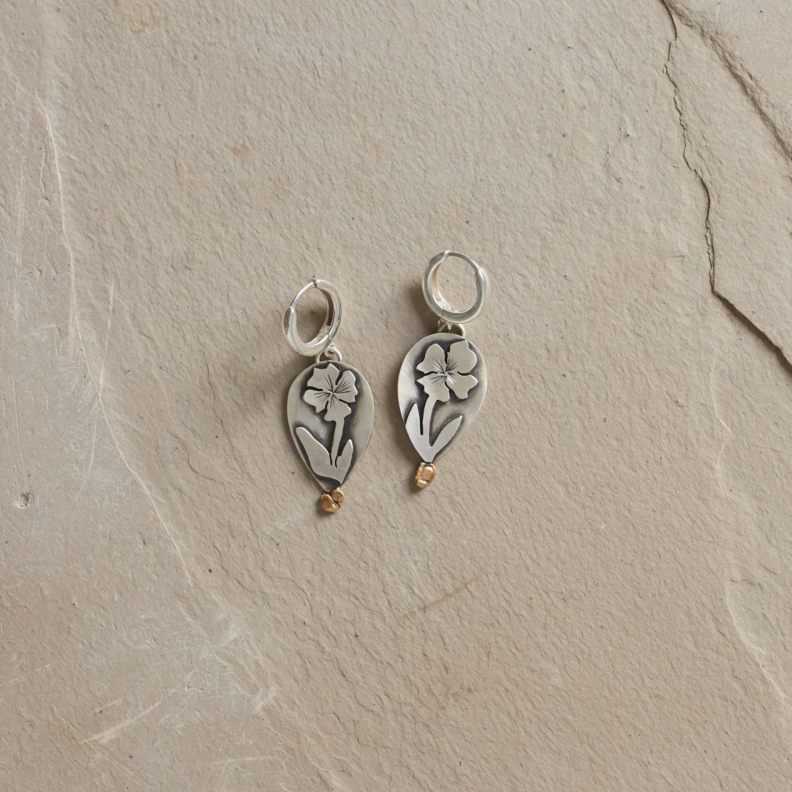 Gorgeous everyday huggie earrings featuring beautiful amapola flower scenes that are hand drawn, sawed and appliquéd onto inverted teardrop discs with brass details. Oxidized and polished to accent the details. These measure 1.75 inches long and hang from sterling silver click back lever style huggie hoops.