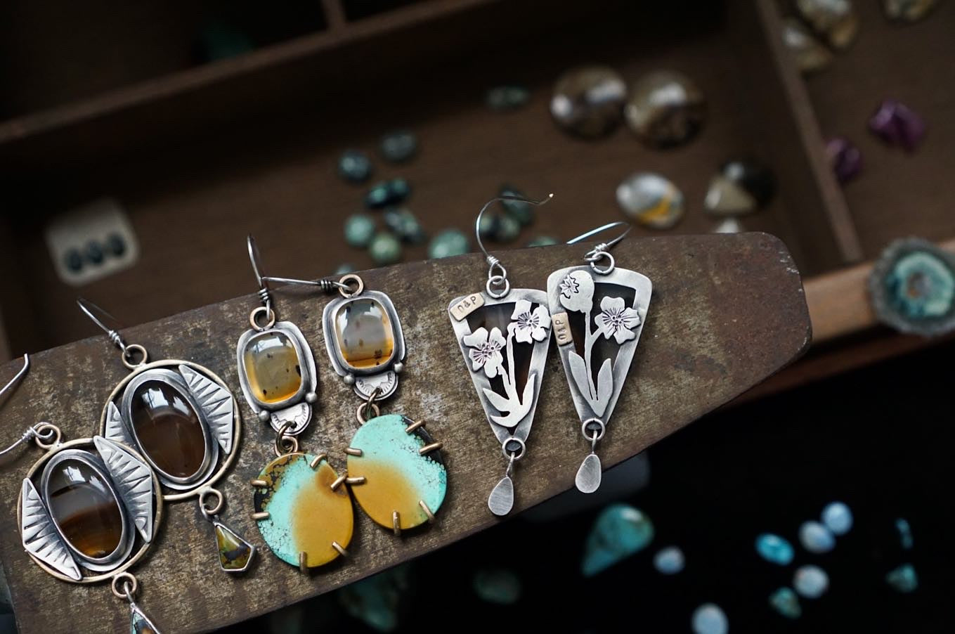 Amazing earrings made with exquisite slices of Montana Agate, these beauties feature a window setting so the light can shine through the stones and incredible hand stamped and sawn details around the edge of hand formed brass hoops. Teeny tiny hand set slices of earthy green, brown and blue turquoise stones dangle below. Finished with hand crafted sterling silver earwires and measuring about 2.75 inches long.