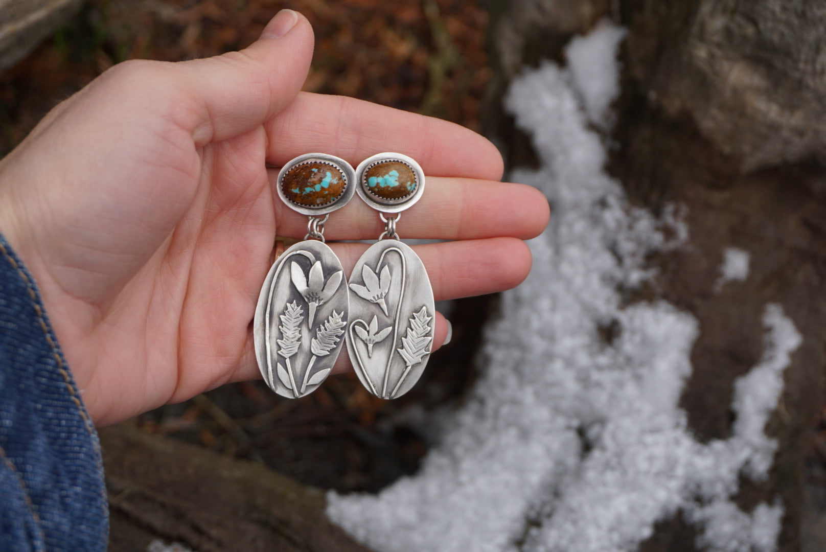 Gorgeous earrings featuring extra webbed Turquoise gemstones simply set as post earrings. Dangling below are beautiful and intricate wildflower scenes that are hand drawn, sawed and appliquéd to larger oval discs. This pair features Indian Paintbrush and Shooting Stars. These earrings have nice movement and are oxidized and polished to accent the details. These measure 2.25 inches from the top of the post to the base of the larger oval.