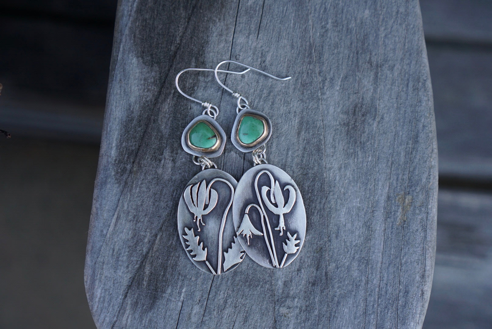 Gorgeous earrings featuring stunning green Turquoise gemstones simply set in 14kt gold bezels. Dangling below are beautiful and intricate wildflower scenes that are hand drawn, sawed and appliquéd to larger oval discs. This pair features lovely bunches of Glacier Lily and Indian Paintbrush. These earrings have nice movement and are oxidized and polished to accent the details. These measure almost 3 inches from the top of the earwire to the base of the larger oval.