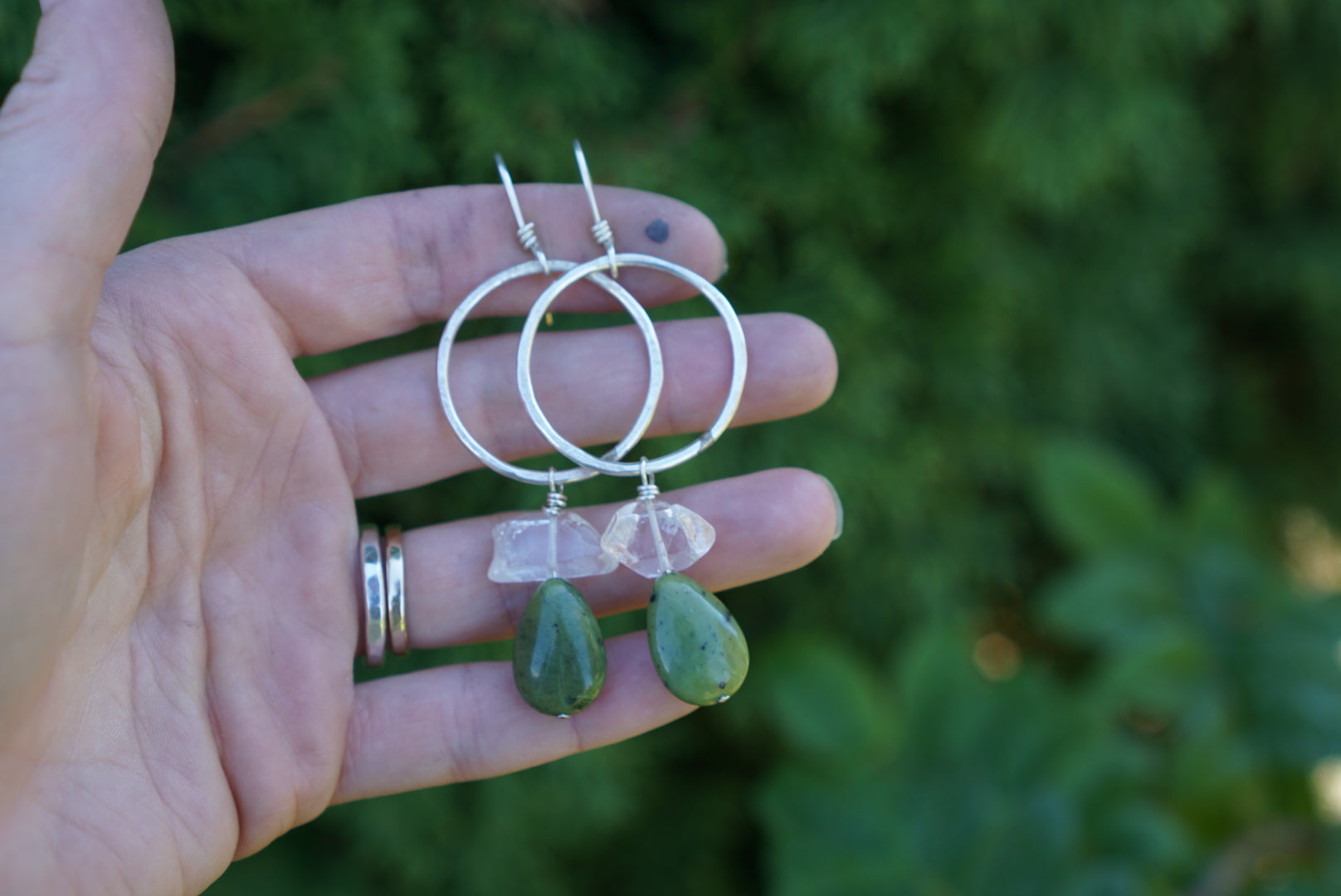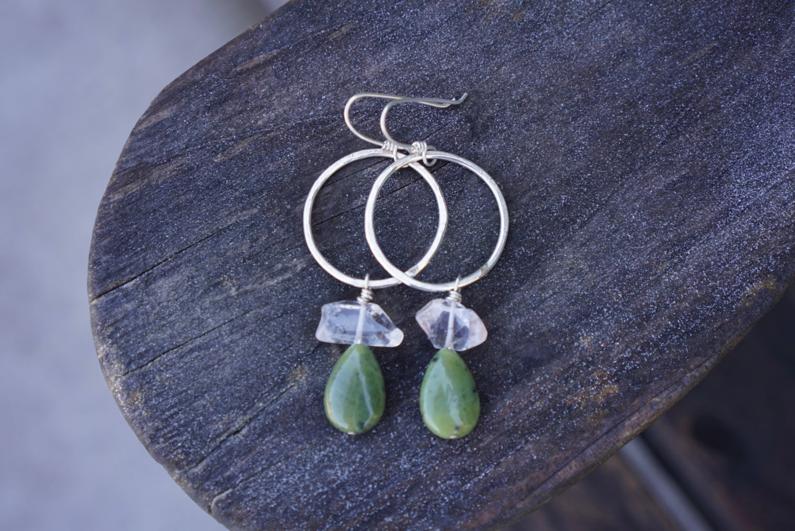 Perfectly plain hand forged sterling silver hoops, lightly hammered with Jade and Quartz stacks dangling below. Finished with handmade sterling silver earwires. Measure about 3 inches long and the diameter of the hoop is just over 1 inch.