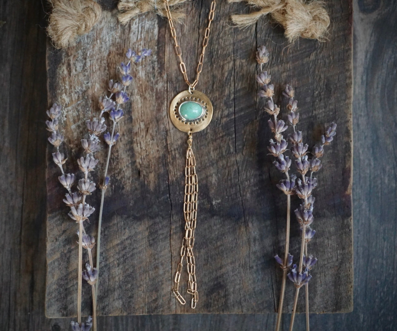 This gorgeous brass necklace features a little American mined hunk of turquoise set In a sterling silver bezel on a round pendant with hand stamped details and a long dangly brass tassel at the bottom. Finished with a brass Lobster clasp. This necklace measures 17 inches long and the tassel is 3.5 inches long.